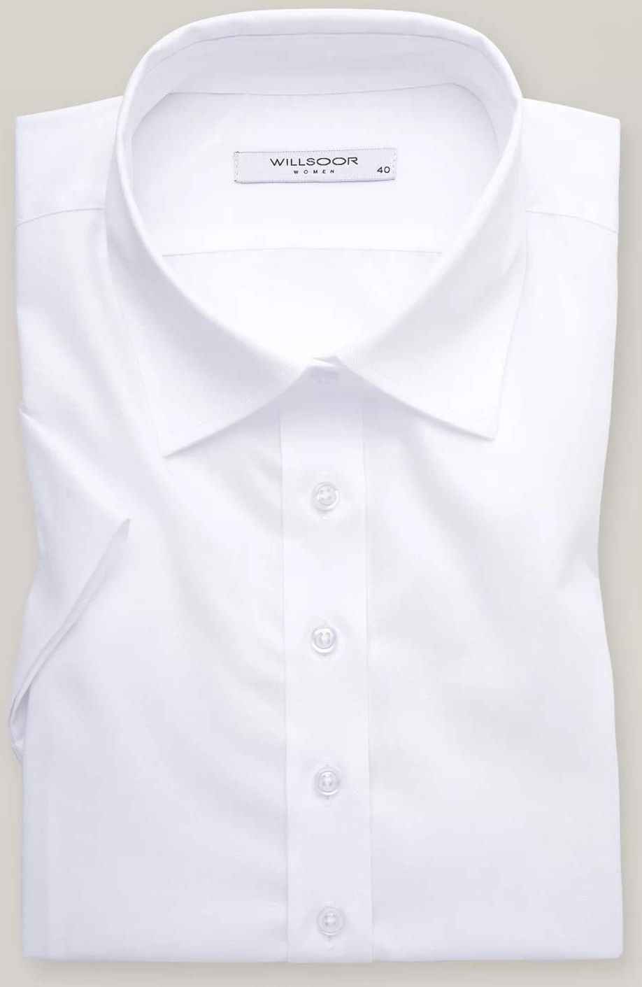 Biała, taliowana koszula damska o gładkiej fakturze, z krótkim rękawem i klasycznym kołnierzykiem, 100% bawełny z Formułą 2 W Plus