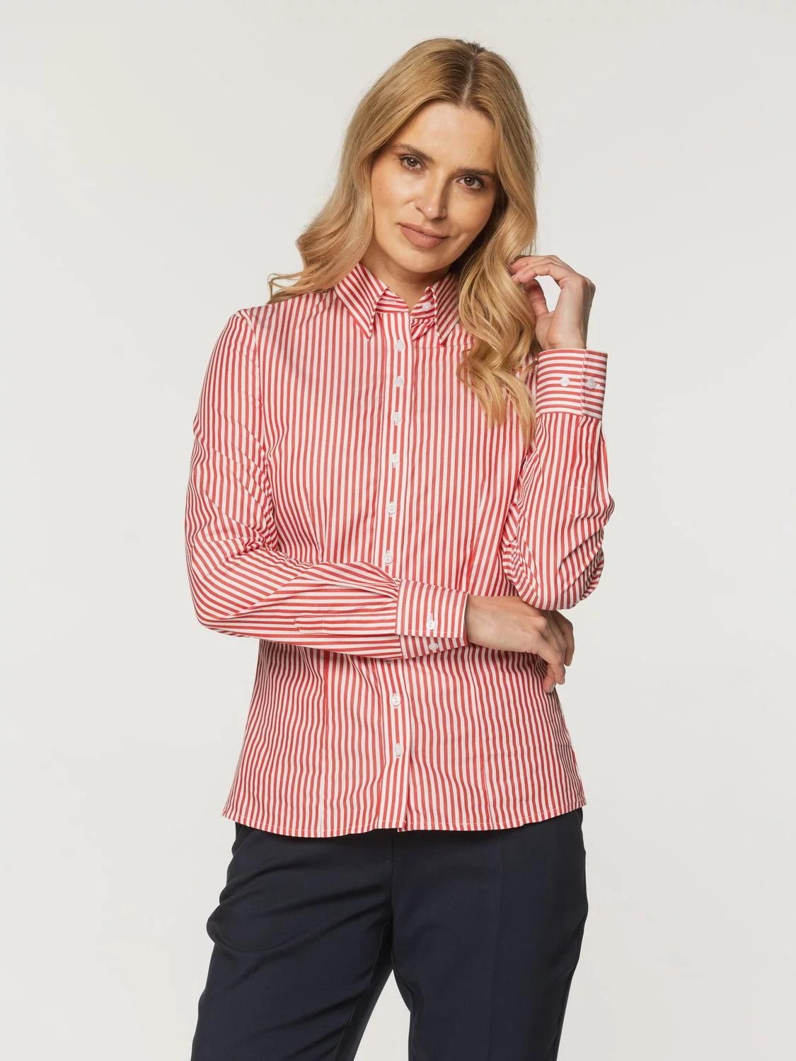 Taliowana koszula damska w czerwone i białe paski z krytym, podpinanym kołnierzykiem, 100% bawełna
