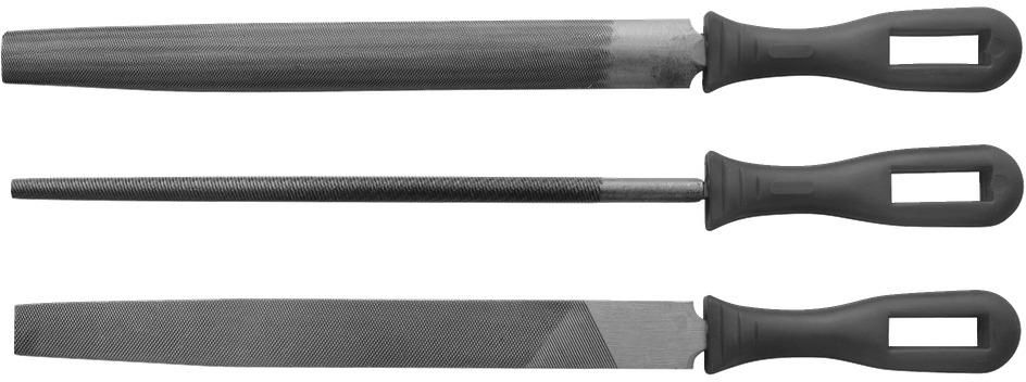 Zestaw pilników zawierający pilnik z krawędzią gładką, półokrągły i okrągły. Ostrza mają długość 200 mm i są wykonane ze stali węglowej.