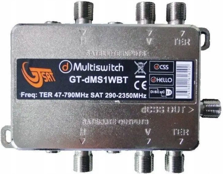 Multiswitch Wide Band na Unicable II GT-SAT 24x UB Canal+ Polsat Box MSUWBGT-DMS1TWBT Multiswitch Wide Band na Unicable II 24xUB Canal+ Polsat Box GT-SAT GT-dMS1TWBT Programowalny multiswitch firmy GT-SAT model GT-dMS1TWBT działa w nowej technologi Wilde Band. Technologia do obsługi multiswitcha wykorzystuje dwa przewody poprowadzone z specjalnych konwerterów Wide Band. Multiswitch umożliwia rozbudowę instalacji w systemie Wide Band o kolejne dodatkowe 24 kanały pracy. Idealne rozwiązanie kiedy mam zainstalowany LNB typu Wide Band na antenie satelitarnej i doprowadzony sygnał bez pośrednio do odbiornika a chcemy instalację rozszerzyć o kolejne np. odbiorniki multiroom. Wówczas tylko wpinamy tylko multiswitch pomiędzy LNB Wide Band a odbiornik. GT-dMS1TWBT posiada wyjście Unicable I/II które obsługuje 24 częstotliwości pracy. Zaprogramowany pod następujące odbiorniki: Polsat Box - Technologia Unicable I/II (EN50494 + EN50607): Evobox PVR - Tedchnologia I Unicable I (EN50494): Mini HD 2000, HD 3000, HD 5000, HD 5500s, HD 6000, HD 7000 PVR Canal+: - Technologia Unicable I/II (EN50494 + EN50607): 4K UltraBOX - Technologia I Unicable I (EN50494): mediaBOX+ (ADB ITI-3740SX), turboBOX+ (ADB ITI-5720SX), wifi PremiumBOX+ (ADB NCP-4740SF), BOX+ ADB ITI-2849/2850/2851S), PVR BOX+ (ITI-5800SX) Multiswitch posiada jedno wyjście sygnału Unicable II - 24 częstotliwości Unicable II Wykaz zaprogramowanych 24 częstotliwości dla odbiorników SAT: Unicable I EN50494 1 1210MHz (EN50494 + EN50607) 2 1420MHz (EN50494 + EN50607) 3 1680MHz (EN50494 + EN50607) 4 2040MHz (EN50494 + EN50607) 5 978MHz (EN50494 + EN50607) 6 1028MHz (EN50494 + EN50607) 7 1072MHz (EN50494 + EN50607) 8 1116MHz (EN50494 + EN50607) Unicable II EN50607 9 1160MHz (EN50607) 10 1271MHz (EN50607) 11 1315MHz (EN50607) 12 1359MHz (EN50607) 13 1484MHz (EN50607) 14 1528MHz (EN50607) 15 1572MHz (EN50607) 16 1616MHz (EN50607) 17 2084MHz (EN50607) 18 2128MHz (EN50607) 19 1816MHz (EN50607) 20 1860MHz (EN50607) 21 1904MHz (EN50607) 22 1948MHz (EN50607) 23 1992MHz (EN50607) 24 1728MHz (EN50607) Dane techniczne Częstotliwość wejściowa 10,7 ~ 12,75 GHz Częstotliwość wyjściowa 950 ~ 2150 MHz Częstotliwość LO 10,4 GHz Liczba pasm użytkowników 2 wyjścia po 16 kanałów Pasmo przenoszenia użytkownika do 74 MHz Sygnał sterujący EN50494, EN50607, dHello Komunikacja DiSEqC 2.0 Zakres temperatury pracy -30 ° C ~ + 65 ° C