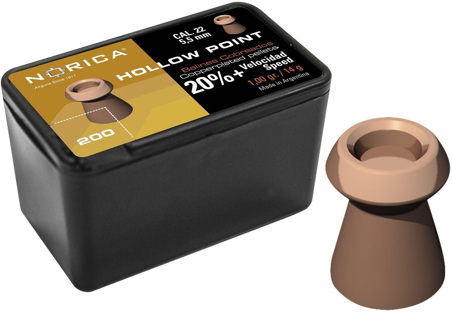 Śrut Norica Hollow Point 4,5mm (198.00.003) to wysokiej klasy miedziane śruciny do pistoletów i karabinków wiatrówkowych. Doskonałe połączenie precyzji i siły uderzenia - nawet z dużej odległości. Proces produkcji zapewnia wszystkie normy dotyczące jakości i precyzji ich wykonania co potem przekłada się na doskonałą celność przy strzelaniu do celu. Jego płaski kształt zwiększa opór powietrza, jednak kształt przestrzeliny w tarczy jest równy. Miedziane śruciny mają 20% większą prędkość niż ołowiane w podobnej wadze. Jest to bardzo precyzyjny śrut, który nadaje się do strzelectwa dynamicznego. Jest to śrut wykonany tak precyzyjnie, że poprawia celność nawet tych słabszych wiatrówek, nawet na dużych odległościach. Zdecydowanie najlepiej sprawdza się w wiatrówkach Norica, jednak nie ma przeciwwskazań, aby strzelać nim z karabinków innych marek. Plastikowe pudełko zawiera 400 szt. śrutu.