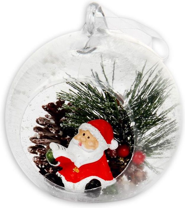 - zawieszka świąteczna w kształcie kuli z limitowanej kolekcji Ho! Ho! Ho! - od wewnątrz ozdobiona małymi gwiazdkami i oprószona sztucznym śniegiem - w środku figurka Mikołaja oraz imitacja szyszki i gałązki jodły - na górze kuli zawieszka z tasiemką - na dole otwór o średnicy 2 cm - materiał: tworzywo sztuczne