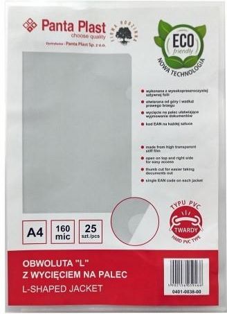 Obwoluta L PVC - 25 sztuk w opakowaniu Pakiet zawiera 25 sztuk obwolut L PVC wykonanych z wysokiej jakości sztywnej folii. Te praktyczne i trwałe obwoluty są idealnym rozwiązaniem do przechowywania i ochrony dokumentów przed zabrudzeniem czy uszkodzeniem. Obwoluty te charakteryzują się otwarciem od góry oraz wzdłuż prawego brzegu, co ułatwia włożenie i wyjęcie dokumentów. Dodatkowo, specjalne wycięcie na palec pomaga w szybkim i łatwym dostępie do przechowywanych materiałów. Użyj obwolut L PVC Panta Plast do zachowania porządku i estetyki Twoich dokumentów zarówno w domu, jak i w biurze. Wybierając te obwoluty, zyskujesz nie tylko praktyczne narzędzie, ale również estetyczny dodatek do swojej przestrzeni pracy. EAN: 5902156059466