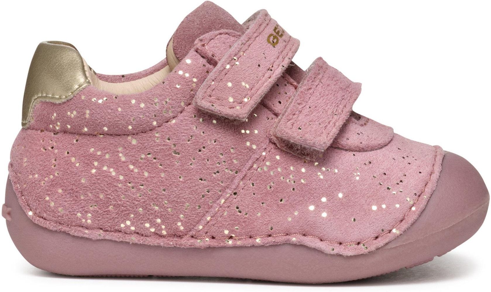 PIERWSZE KROCZKI GEOX TUTIM B9940B 007NF C8233 Rozmiar: 23 Długość wkładki: 15 cm Kolor: fioletowy ze srebrnymi drobinkami Materiał wierzchni: skóra naturalna zamszowa Wnętrze: skóra naturalna Wkładka: skórzana, lekko profilowana, wyjmowana Zapięcie: rzepy Jeśli potrzebujesz pomocy w doborze odpowiedniego rozmiaru dla Twojego dziecka, chętnie pomożemy :) Przy produkcji bucików GEOX zostały wykorzystane nowoczesne technologie: Geox Respira - połączenie perforowanej podeszwy oraz wodoodpornej membrany, co zapewnia cyrkulację powietrza, utrzymanie optymalnej temperatury zachowując wodoszczelność podczas deszczowych dni Flexy System - elastyczna podeszwa nieograniczająca ruchów Softly Cushioned - technologia pochłaniająca drgania oraz amortyzująca stopę przy zetknięciu z podłożem Włoska marka GEOX to jeden z najważniejszych producentów obuwia dziecięcego w Europie. Przede wszystkim kładzie nacisk na badania oraz nowe technologie. Łączy ze sobą wysoką jakość wykonania oraz nowoczesny wygląd.