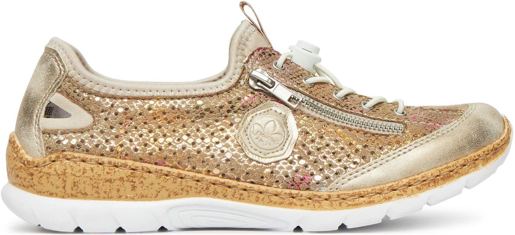 Beżowe półbuty damskie Rieker to idealne połączenie stylu i komfortu. Wykonane z włókienniczego materiału, są niezwykle przewiewne i wygodne, dzięki czemu Twoje stopy będą czuły się świetnie przez cały dzień. Elastyczne sznurówki umożliwiają szybkie i łatwe dopasowanie butów do stóp, co jest szczególnie wygodne w codziennym użytkowaniu. Dzięki technologii Rieker Antistress, buty oferują wyjątkową amortyzację oraz redukcję nacisku na stopy, zapewniając komfort podczas każdej aktywności. To idealny wybór dla kobiet, które cenią sobie wysoką jakość i wygodę w modnym wydaniu! Od ponad stu lat marka Rieker oferuje niezwykle komfortowe i trwałe obuwie, które powstaje z myślą o zdrowiu stóp. Dzięki wieloletniemu doświadczeniu w produkcji obuwia, ta niemiecka marka doskonale potrafi łączyć wygodę ze stylem, dlatego w ofercie znajdziesz buty w modnych, oryginalnych fasonach, które każdemu przypadną do gustu. Buty Rieker tworzone są z materiałów wysokiej jakości, przez co odznaczają się wyjątkową elastycznością i trwałością, ale też lekkością. Ponadto w obuwiu stosuje się szerszą formę zapewniającą odpowiednią stabilizację stopy, specjalne podeszwy absorbujące wstrząsy oraz odciążające stawy i kręgosłup, a także wyjmowane wkładki z pianki Memory Foam, która idealnie dopasowuje się do kształtu stóp. To doskonałe produkty dla tych, którzy ponad wszystko cenią sobie komfort. Przekonaj się!