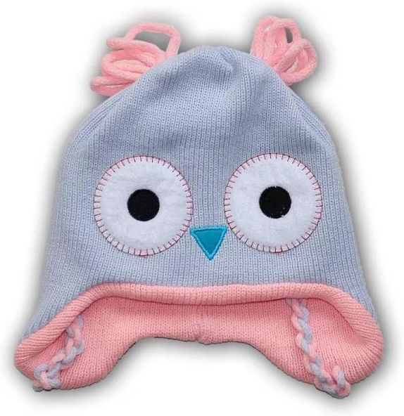 Ciepła, dwuwarstwowa czapka zimowa dla dziewczynki. Wiązana pod bródką, z nausznikami. Przód czapki zdobią duże sowie oczy i mały dziubek. Na górze czapeczki para uszek ze sznureczków.