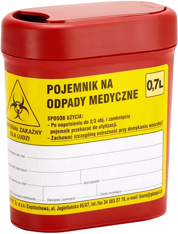 Pojemnik na odpady medyczne 0,7 l czerwony Pojemnik na odpady medyczne o pojemności 0,7 litra to niezawodne rozwiązanie do bezpiecznego zbierania, składowania, transportu i utylizacji stałych, niebezpiecznych odpadów medycznych. Jest idealny do użytku w szpitalach, klinikach, gabinetach kosmetycznych oraz innych placówkach medycznych. Pojemnik został zaprojektowany z myślą o zapewnieniu maksymalnego bezpieczeństwa personelu medycznego, zapobiegając niepożądanym zdarzeniom takim jak zakłucia i skaleczenia. Cechy Produktu 🛡️ Bezpieczeństwo i higiena: Przeznaczony do bezpiecznego składowania ostrych odpadów medycznych, takich jak igły, strzykawki, rękawiczki jednorazowe. 🔒 Dwufunkcyjne wieko: Umożliwia tymczasowe lub permanentne zamknięcie pojemnika, zapewniając bezpieczeństwo. 🧴 Odporność na chemikalia: Pojemnik odporny na promieniowanie UV, formalinę i alkohol etylowy. 📋 Etykieta BML: Wtopiona etykieta z międzynarodowym znakiem ostrzegawczym, ułatwiająca wpisanie danych odpadów. 🌈 Kolory ostrzegawcze: Standardowy kolor czerwony z możliwością zamówienia w kolorze żółtym lub niebieskim. Zastosowanie produktu Pojemnik jest przeznaczony do zbierania stałych, niebezpiecznych odpadów medycznych, takich jak igły, kaniule dożylne, strzykawki, rękawiczki jednorazowego użytku. Umożliwia bezpieczne składowanie, transport i utylizację tych odpadów, zapewniając bezpieczeństwo higieniczno-sanitarne oraz mechaniczne. Najważniejsze składniki Materiał pojemnika: Polietylen wysokiej gęstości (HDPE) Materiał pokrywy: Polipropylen (PP) Kolor: Czerwony ostrzegawczy (inne kolory dostępne na zamówienie) Stosowanie Pojemnik należy używać zgodnie z przeznaczeniem, wrzucając do niego tylko stałe, niebezpieczne odpady medyczne. Po zapełnieniu należy zamknąć wieko tymczasowo lub permanentnie i przekazać do odpowiedniej jednostki zajmującej się utylizacją odpadów medycznych. Dodatkowe informacje Opinia PZH: Posiada pozytywną opinię Narodowego Instytutu Zdrowia Publicznego - PZH. Normy i certyfikaty: Spełnia wymagania norm ASTM F2132-01 oraz PN-EN ISO 175. Bezpieczeństwo: Produkt nie zawiera lateksu i ftalanów, jest jednorazowego użytku i niesterylny. Specyfikacja techniczna Parametr Szczegóły Pojemność 0,7 litra Materiał pojemnika Polietylen wysokiej gęstości (HDPE) Materiał pokrywy Polipropylen (PP) Kolor Czerwony (inne kolory dostępne na zamówienie) Odporność UV, formalina, alkohol etylowy Etykieta Wtopiona etykieta BML z międzynarodowym znakiem ostrzegawczym Normy ASTM F2132-01, PN-EN ISO 175 Opinia PZH Posiada pozytywną opinię Narodowego Instytutu Zdrowia Publicznego - PZH Jednorazowy użytek Tak Niesterylny Tak EAN 5906717451881