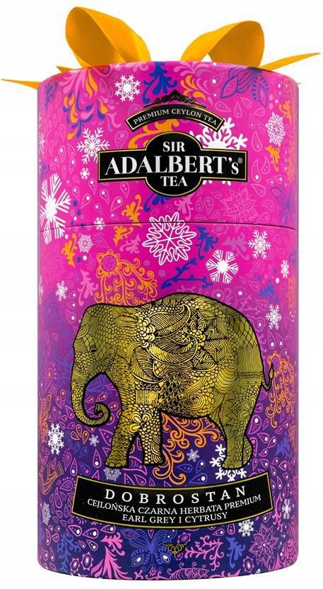 Czarna herbata świąteczna Sir Adalbert's DOBROSTAN 80g czarnej herbaty earl gray Herbata czarna Adalbert's Tea DOBROSTAN kolekcja świąteczna "Emocje" Herbata Dobrostan Adalbert's Tea to filiżanka spokoju i harmonii, która przenosi Cię do świata pełnego równowagi. Ta wyjątkowa cejlońska herbata Earl Grey, wzbogacona nutami cytrusów, to idealne połączenie klasyki i świeżości, które rozbudza zmysły i dodaje energii. Każdy łyk to chwila oddechu, moment zatrzymania się w biegu dnia, by poczuć wewnętrzny dobrostan. Subtelne aromaty bergamotki i cytrusów tworzą kompozycję, która przynosi ukojenie i radość. Podaruj sobie lub bliskim ten wyjątkowy dar – Adalbert's Tea Dobrostan to smak, który przynosi harmonię i wewnętrzne szczęście. Eleganckie i oryginalne opakowanie, uzupełnione stylową kokardą, podkreśla wyjątkowość tego prezentu. Zachwyci osobę obdarowaną swą ekskluzywnością. Przygotowanie Wsyp 1 łyżeczkę herbaty do filiżanki i zalej świeżo zagotowanym wrzątkiem (100 °C). Parz przez 3-5 minut, w zależności od tego, czego potrzebujesz w danej chwili. Herbata czarna, parzona przez 3 minuty, doda Ci energii, a jeśli pozwolisz jej parzyć się przez 5 minut, zanurzysz się w chwilach relaksu. Dopasuj filiżankę herbaty do swojego nastroju i ciesz się magią chwili. CECHY PRODUKTU Rodzaj herbaty: czarna aromatyzowana Typ: liściasta Czas parzenia: 3-5 min Temperatura parzenia: 95-100 °C Skład: czarna herbata cejlońska OP1 96%, olejek bergamotki 1%, aromat cytrusowy 1% Opakowanie: 80g ---------------------------------------------------------------- Najlepiej spożyć przed: 30-08-2027