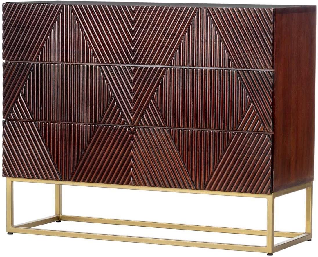 Komoda Mogano, 100 x 40,5 x 81 cm Kod produktu: 005-716 Komoda z drewna mahoniowego w kolorze brązowym. Komoda Mogano z ozdobnym frontem na metalowym, złotym stelażu to mebel dla koneserów oryginalnego designu. Wykonana z wysokogatunkowego i trwałego drewna mahoniowego, gwarantuje użytkowanie przez długie lata. Ten nietuzinkowy mebel odmieni wystrój Twojego wnętrza, jeśli szukasz nowego wyposażenia do salonu, sypialni czy gabinetu. Prosta bryła urozmaicona została dekoracyjnym frontem w geometryczny wzór, który komponuje się we wnętrzach urządzonych w stylu nowoczesnym lub kolonialnym. Przykuwający wzrokozdobny front w połączeniu z metalowym złotym stelażem, dodaje komodzie niezwykłej elegancji. Komoda Mogano to efektowny i praktyczny mebel, dzięki któremu zadbasz o organizację swojej przestrzeni. Trzy, pojemne szuflady pomieszczą ulubione przedmioty i czasopisma, a Ty przestaniesz martwić się o porządek. Zestawienie klasycznego brązu ze złotym kolorem nadaje całości niezwykłej elegancji i podkreśla unikatowy charakter mebla. Dobrze łączy się z innymi wzorami czy barwami w podobnym tonie, ułatwiając stworzenie wymarzonej aranżacji. Nowoczesna komoda Mogano to idealna ozdoba wnętrza, któremu chcesz nadać unikatowego charakteru. Skompletuj ją z innymi meblami tej serii i stwórz wymarzoną aranżację w Twoim domu. Komoda wykonana z wysokogatunkowego i trwałego drewna mahoniowego. Złoty stelaż posiada gumowe podkładki, zabezpieczające podłogę przed zarysowaniem. Wymiary: szer. 100 cm, gł. 40,5 cm, wys. 81 cm. Materiał: drewno: mahoń; stelaż: metal. Kolor: brązowy/złoty. Dane produktu Waga: 40.00kg Rozmiar: 100 x 40,5 x 81 cm Materiał: metal, drewno mahoniowe Rodzaj mebla: komoda Pomieszczenie: salon, sypialnia, gabinet Seria: Mogano