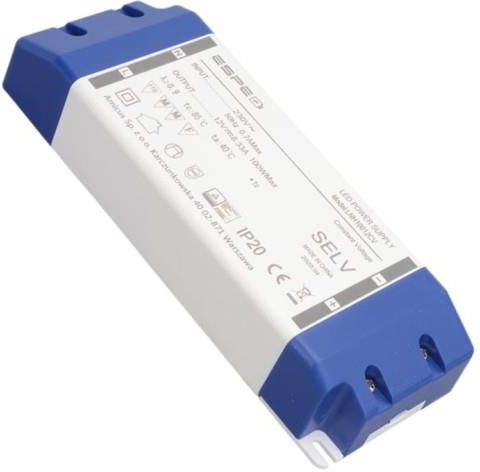 Płaski zasilacz LED 12V 100 Watt profesjonalny serii LN Wysokiej jakości profesjonalny zasilacz Led ESPE serii LN stało-napięciowy 12V o mocy 100 Watt. Transformator do taśmy LED na 12V, do żarówek LED i modułów ledowych na 12V. Zasilacz ledowy w zamkniętej obudowie. Płaskie zasilacze Led z serii LN PRO to wysokiej jakości zasilacze do montażu w zabudowie meblowej, do montażu w zabudowie sufitowej lub w listwie zabudowy karnisza. Zasilacze serii LN PRO posiadają zamkniętą wytrzymałą obudowę plastikową, a jego przyłącza zasilające na 230V i na 12V są schowane pod specjalnymi przysłonami, co zapewnia bezpieczeństwo użytkowania zasilacza, oraz zapobiega przed przypadkowym porażeniem prądem i napięciem. Zasilacz w płaskiej obudowie plastikowej meblowej zamkniętej, jest to zasilacz z serii Premium, który znajdzie swoje zastosowanie w bardziej wymagających instalacjach oświetleniowych. Podstawowe zastosowanie zasilacza LED: zasilanie taśm ledowych napięciem 12V, zasilanie dla listwy ledowej 12V, zasilanie modułów ledowych 12V, zasilanie dla żarówek ledowych MR16 i G4 na 12V. Podstawowe parametry zasilacza Led: napięcie znamionowe na wyjściu: DC12V, moc znamionowa: 100 Watt, znamionowe obciążenie prądowe: 8.3A, sprawność zasilacza: ⩾85%, maksymalne bezpieczne obciążenie dla zasilacza: 80 Watt, napięcie zasilania na wejściu: AC 220V-240V, częstotliwość napięcia zasilania: 50Hz-60Hz, zabezpieczenie przeciążeniowe: tak, zabezpieczenie zwarciowe: tak, zabezpieczenie przepięciowe: tak, klasa ochronności: II, klasa szczelności: IP30, chłodzenie zasilacza: pasywne, obudowa zasilacza: plastikowa ABS, gniazda przyłączeniowe: zaciskowe-śrubowe ukryte, wymiary zewnętrzne zasilacza (dł. x szer. x wys.): 181mm x 66mm x 32mm