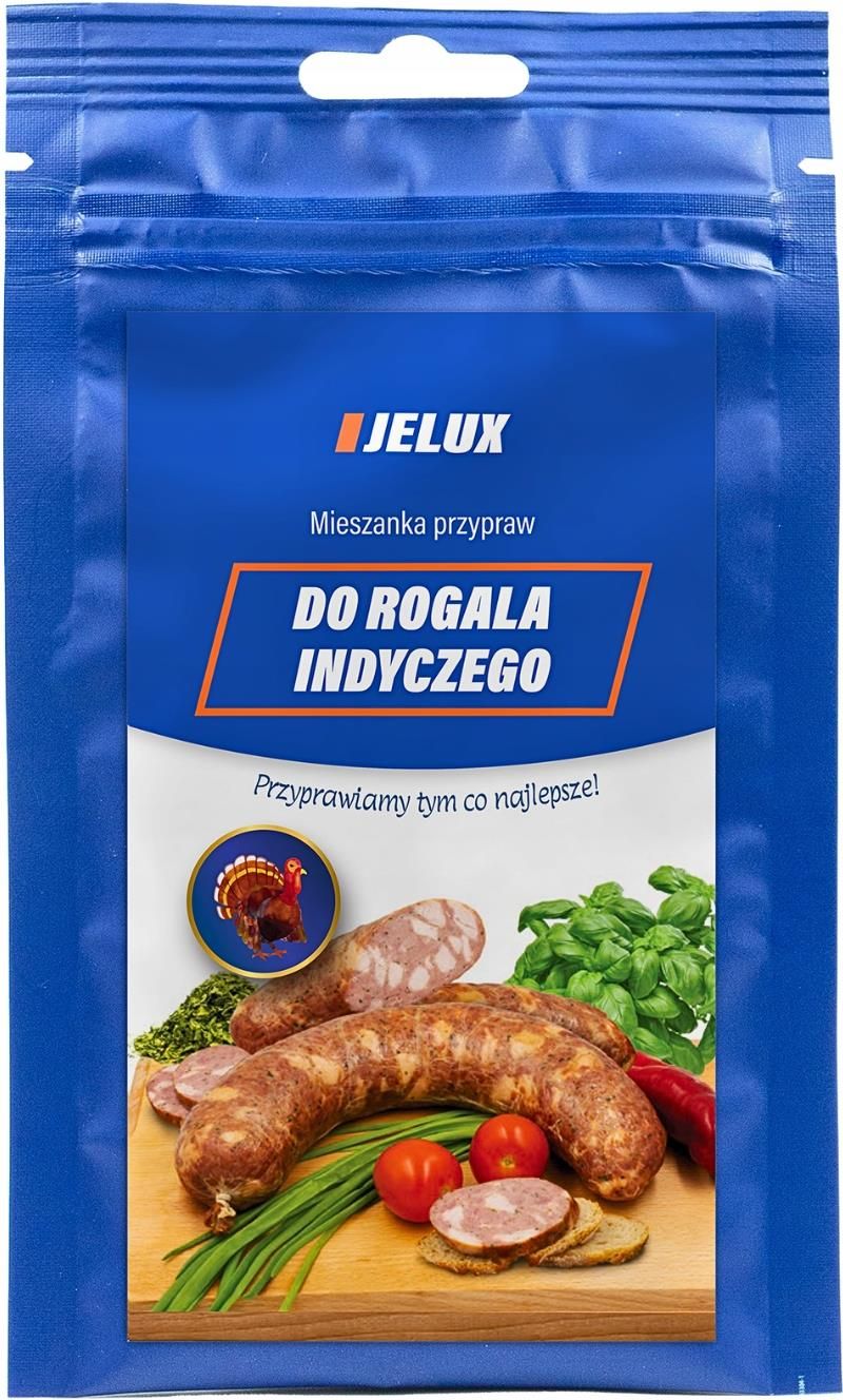 MIESZANKA PRZYPRAW DO ROGALA INDYCZEGO 110G - NATURALNA, ZDROWA, BEZ CHEMII Najwyższa jakość Odkryj mieszankę przypraw do "rogala indyczego", który zachwyci każde podniebienie, Starannie dobrane składniki podkreślają delikatność i wyrazisty smak mięsa z indyka, które jest w 100% wolne od antybiotyków. Mieszanka pozwoli Ci na przygotowanie pysznych, aromatycznych i zdrowych wędlin dla całej rodziny i przyjaciół. Masa netto: 110 g Producent: Jelux Rodzaj: do rogala indyczego 110 g tej mieszanki pozwoli Ci na przygotowanie ok. 5 kg domowego wyrobu. Składniki: peklosól (sól, substancja konserwująca: azotyn sodu), pieprz biały, czosnek niedźwiedzi, cukier, papryka wędzona, kolendra, czosnek granulowany. Przepis na "Rogal Indyczy" (na 5 kg mięsa) Składniki Mięso z udźca indyczego (bez skóry) – 3,5 kg Mięso z piersi indyka – 1,5 kg Mieszanka przypraw Jelux do rogala indyczego – 110 g (22 g na 1 kg mięsa) Kątnica barania (jelito ślepe) Jelux o pojemności ok. 2 kg Zimna woda – 250 ml Przyprawa do rogala indyczego - To unikalna mieszanka przypraw i ziół o starannie dobranej kompozycji, nadająca tradycyjny smak i aromat domowej kiełbasy. Doskonały smak, nowe opakowanie - teraz Twoją ulubioną mieszankę przypraw i ziół zapakowaliśmy w barierowy doypack ze struną, abyś mógł cieszyć się trwałym aromatem mieszanki przez długi czas. Tradycyjna - idealna mieszanka przypraw i ziół do rogala indyczego sprawdzi się do przygotowania tradycyjnych wyrobów nie tylko na święta, ale i na co dzień! Naturalne składniki - pieprz biały, czosnek niedźwiedzi, cukier, papryka wędzona, kolendra, peklosól, czosnek granulowany - to gwarancja sukcesu: fantastycznego aromatu i niezapomnianego smaku! Bez chemicznych dodatków - nasza mieszanka nie zawiera substancji polekszających typ "E", glutaminianu sodu ani wzmacniaczy smaku. Wybierając nasz produkt, masz więc gwarancję naturalnych, zdrowych i bezpiecznych składników! Wydajne opakowanie - jedna saszetka o gramaturze 110 g wystarcza na przygotowanie 5 kg kiełbasy! Bez problemu przygotujesz więc wyrób na święta lub spotkanie przy grillu w większym gronie przyjaciół! Zdrowa! Stawiamy na mięso z indyka, aby mieć pewność braku antybiotyków i innych nie pożądanych składników w mięsie. Sposób przygotowania 1. Przygotowanie mięsa Oczyszczamy mięso z udźca z chrząstek i przerostów. Mięso z udźca mielimy na sitku 10 mm. Mięso z piersi kroimy w kostkę 1,5 cm × 1,5 cm. 2. Przygotowanie farszu Mieszamy oba rodzaje mięsa. Dodajemy mieszankę przypraw Jelux. Wlewamy 250 ml zimnej wody i mieszamy do uzyskania kleistej konsystencji. 3. Leżakowanie farszu Odkładamy na 12 godzin do lodówki. 4. Formowanie rogala Po upływie 12 godzin krótko mieszamy farsz. Nadziewamy wcześniej przygotowaną kątnicę baranią za pomocą nadziewarki. 5. Pieczenie Rozgrzewamy piekarnik do 85°C (termoobieg). Pieczemy przez 30 minut. Podnosimy temperaturę do 95-100°C i pieczemy do uzyskania 70-72°C wewnątrz wyrobu. 6. Studzenie i gotowy produkt Po osiągnięciu odpowiedniej temperatury wyjmujemy produkt i pozostawiamy do samoistnego wystudzenia. Po ostygnięciu rogal indyczy jest gotowy do spożycia. Marzysz o aromatycznej, delikatnej i niezwykłej w smaku zdrowej, domowej kiełbasie? Chcesz przenieść się do czasów, gdy potrawy nie były pełne chemii i sztucznych dodatków? Jest na to sposób! Z naszą mieszanką przypraw i ziół z łatwością przygotujesz pyszne, aromatycznie, tradycyjne i rozpływające się w ustach kiełbasy tylko z naturalnych składników! Jest na to sposób! Z naszą mieszanką przypraw i ziół z łatwością przygotujesz pyszne, aromatycznie, tradycyjne i rozpływające się w ustach kiełbasy tylko z naturalnych składników! Mieszanka przypraw do rogala indyczego to zbiór specjalnie wyselekcjonowanych, naturalnych przypraw i ziół bez substancji typu "E", wzmacniaczy smaku oraz glutaminianu sodu. W skład mieszanki wchodzą: pieprz biały, czosnek niedźwiedzi, cukier, papryka wędzona, kolendra, peklosól, czosnek granulowany - wybierając nasz produkt, masz więc gwarancję bezpiecznej i zdrowej żywności! Jedno opakowanie 110 g wystarcza na przygotowanie aż 5 kg kiełbasy! Tradycyjny aromat naszej mieszanki do rogala indyczego idealnie uzupełni zdrowe i wolne od antybiotyków mięso z indyka. Zachwyć swoich bliskich smakiem zdrowego rogala indyczego! Produkt może zawierać: soję, seler, gorczycę, zboża zawierające gluten (pszenica), dwutlenek siarki. Przechowywać w suchym i zacienionym miejscu.