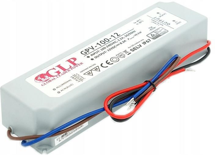 Profesjonalny wodoodporny zasilacz do LED o mocy znamionowej 100W, na napięcie DC 12V marki GLP Power. Zasilacz Led model GPV-100-12, to zasilacz w wąskiej hermetycznej obudowie IP67, który został wykonany z najwyższej jakości komponentów. Marka Global Leader Power, to renomowana jakości i trwałość na rynku urządzeń do zasilania oświetlenia LED. Model GLP GPV to niezawodny zasilacz hermetyczny w zamkniętej bezpiecznej obudowie do taśm LEDowych, zasila do żarówek LED, zasilacz do listw LEDowych oraz modułów LED na napięcie 12V. Parametry techniczne moc znamionowa zasilacza: 100 Watt prąd znamionowy zasilacza: 8.3A maksymalna moc obciążeniowa zasilacza: do 80 Watt (patrz UWAGA) napięcie na wyjściu: 12V typ napięcia na wyjściu: DC - stałe, zasilanie na wejściu: 230V AC (w zakresie 90V÷264V) prąd AC na wejściu: 0.9A / 230V AC zakres częstotliwości napięcia: 47Hz÷63Hz tętnienia i szumy: 200mVp-p obudowa: hermetyczna ABS, chłodzenie: pasywne, klasa szczelności: IP67, klasa izolacji elektrycznej: II, zabezpieczenia: przeciążeniowe, zwarciowe, nadnapięciowe, zakres temperatury pracy: -30°C÷70°C, wymiary (dł. x szer. x wys.): 190mm x 52mm x 37mm. UWAGA: przy doborze mocy zasilacza należy uwzględnić obowiązkowy bezwzględny zapas mocy (Watt) wynoszący minimum 20%. mocy znamionowej zasilacza. (zasilacz o mocy znamionowej 100W, ma maksymalną moc obciążeniową 80W). Zachowanie zapasu powoduje prawidłową pracę zasilacza przez dłuższy czas bez zakłóceń, oraz w znacznym stopniu wydłuża trwałość zasilacza. Podłączenie zasilaczy, które nie posiadają gotowych wtyczek przyłączeniowych, do instalacji elektrycznej oraz oświetleniowej, powinien zostać wykonany przez osoby posiadające odpowiednie kwalifikacje G1 E. W naszej ofercie znajdziesz dodatkowe produkty do taśmy LED taśmy LED: standard, premium i profesjonalne na 12V i 24V, zwykłe, wodoodporne i wodoszczelne, zasilacze LED: montażowe, meblowe, hermetyczne, gniazdkowe i na szynę DIN, profile i listwy do taśm LED: meblowe, podłogowe, architektoniczne, wpuszczane, nawierzchniowe, kątowe i okrągłe, sterowniki LED: RGB, RGBW, MONO, CCT na łączność IR, RF i WiFi oraz kontrolery SmartHome, włączniki LED: włączniki meblowe do profili, włączniki do szafek, włączniki podblatowe, czujki zbliżeniowe, czujki ruchu, przewody i złączki do taśm LED Dlaczego warto wybrać naszą ofertę na rynku oświetleniowym od ponad 10 lat, sprawdzone produkty i sprawdzeni dostawcy, prawdziwe wartości i rzetelne parametry produktów (bez ściemy i bajek), najwyższe zadowolenie klientów (opinie Google), zaufanie renomowanych odbiorców, firma ze sklepami stacjonarnymi, nie twór typowo internetowy, doświadczenie i fachowe doradztwo, oferujemy własny serwis wraz z usługami dodatkowymi (nie tylko zwykła sprzedaż bez wsparcia),