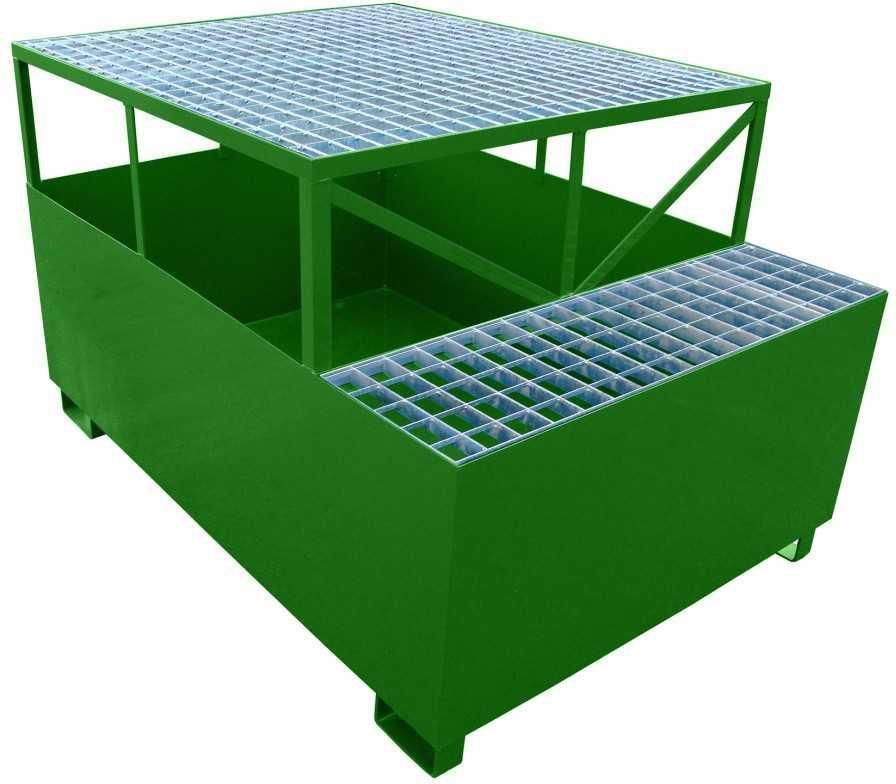 Wanna (paleta) wychwytowa z podstawką na kanistry Model WM-7, stalowa, malowana proszkowo, ze zdejmowalnym ocynkowanym rusztem kratowym, służąca do składowania jednego pojemnika IBC lub innych mniejszych pojemników z substancjami niebezpiecznymi. Stosowana do bezpiecznego magazynowania substancji …