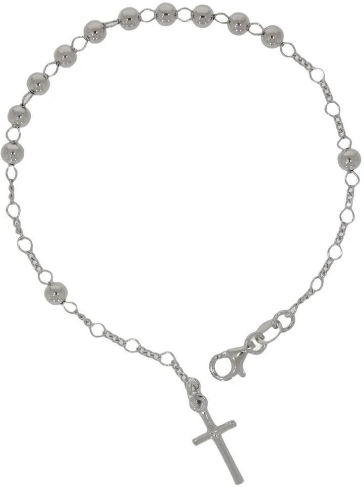 Bransoletka - różaniec srebrny rodowany próby 925 z gładkimi kulkami i krzyżykiem. Długość: ok. 18-20 cm Waga: ok. 2,6-3,0 g Średnica paciorka: ok. 4 mm Wagi i wymiary podane wyżej występują w przedziałach ze względu na różnice partii produkcyjnych. Wszystkie produkty wykonane są z najwyżej jakości srebra próby 925. Potwierdzeniem jest metka oraz nabity imiennik lub cecha probiercza (cecha dla produktów powyżej 5 g zgodnie z ustawą o prawie probierczym). Czym jest rodowanie i co nam daje? Rod jest błyszczącym szarobiałym, niezbyt twardym metalem, jest odporny na działanie wilgoci tlenu i większości kwasów. Rodowanie biżuterii skutecznie ją ochrania, zwiększa twardość, wzmacnia połysk, a także uodparniana na działanie czynników atmosferycznych. Biżuteria pokryta warstwą rodu zachowuje swoje walory przez bardzo długi czas, nie ciemnieje, nie matowieje i jest odporna na wszelkie przebarwienia.