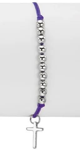 Bransoletka - różaniec, na sznurku - kolor fioletowy Regulowana bransoletka z dziesiątką różańca i krzyżykiem. Materiał: sznurek, metal antyalergiczny Wielkość koralika: 4 mm