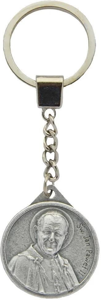 Okrągły, dwustronny brelok z wizerunkiem Jana Pawła II oraz Świętego Krzysztofa. Wykonany z metalu. Średnica: 3,1 cm, długość z zawieszką: 9,7 cm. - opis pochodzi od Dostawcy