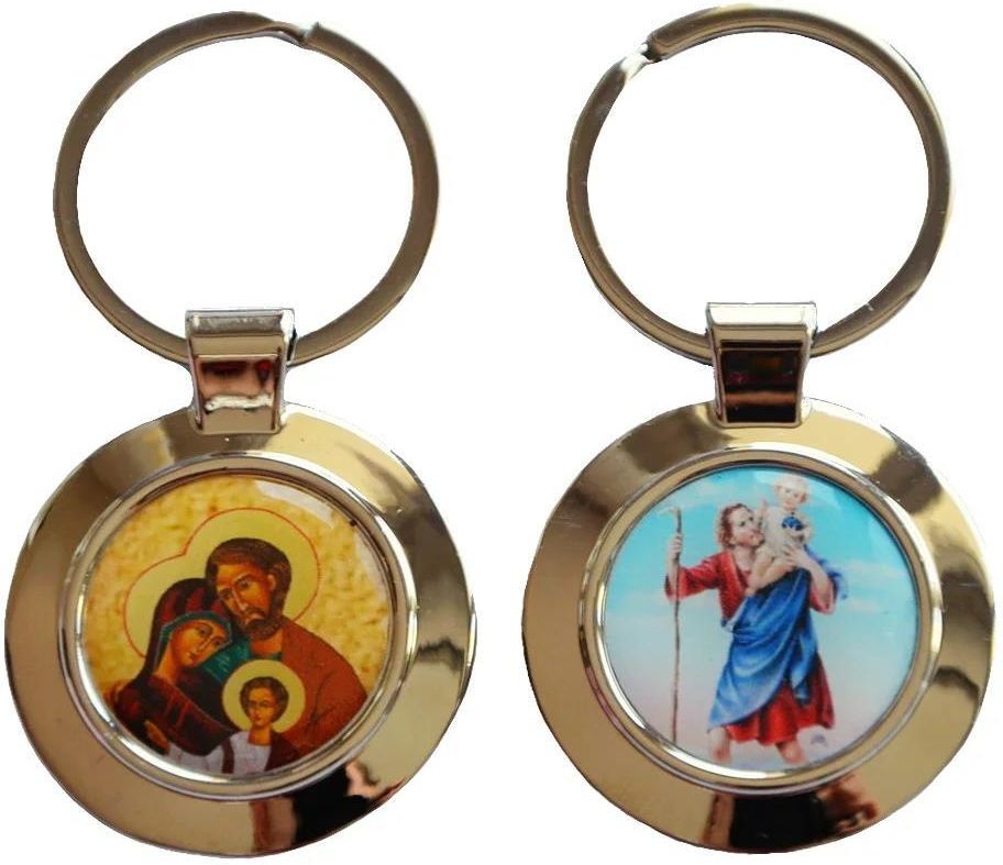 Okrągły, dwustronny brelok z wizerunkiem Świętego Krzysztofa oraz Świętej Rodziny. Wykonany z połyskującego metalu. Średnica: 3,7 cm, długość z zawieszką: 7,5 cm. Św. Krzysztof w tradycji chrześcijańskiej jest patronem kierowców i podróżnych, dlatego brelok będzie idealnym prezentem dla osób prowadzących pojazdy mechaniczne. - opis pochodzi od Dostawcy