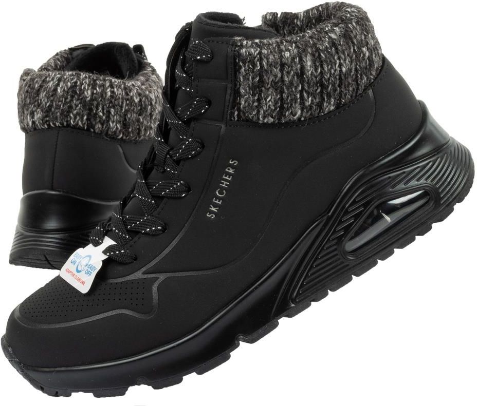 Buty Skechers Uno Darling Daze W 310566L/BLK Właściwości Damskie buty sportowe marki Skechers. Cholewka wykonana z najwyższej jakości gładkiej profilowanej skóry syntetycznej Durabuck. Wysoki, ocieplany kołnierz dodaje uroku stylizacji. Wnętrze obuwia wyściełane miłym polarem. Wkładanie i zdejmowanie obuwia ułatwia zapięcie na zamek. Klasyczny system sznurowania zapewnia idealne dopasowanie do stopy. Komfortowa wkładka Skechers Air-Cooled Memory Foam. Podeszwa środkowa z widoczną poduszką powietrzną Skech-Air. Antypoślizgowa, elastyczna podeszwa zewnętrzna zapewniająca przyczepność. Idealne obuwie do każdej jesienno - zimowej stylizacji. Kolor czarny