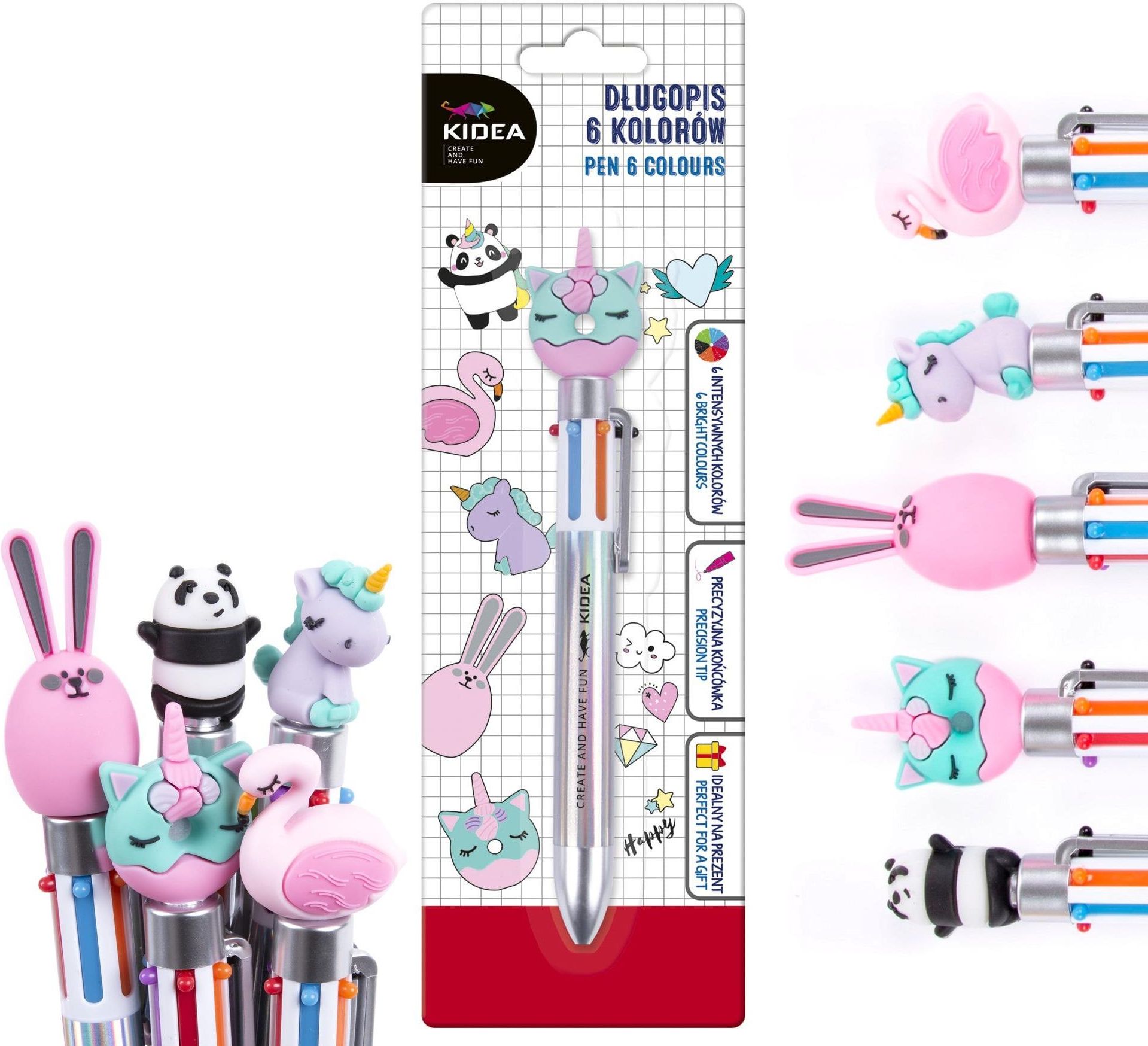 Długopis Wielokolorowy Z Figurką 6 Kolorów Mix Kidea Długopis z figurką z wkładami w sześciu intensywnych kolorach. Jego dodatkowym atutem są urocze figurki: flaming, panda, króliczek, jednorożec i słodki donat, które uatrakcyjniają produkt i sprawiają, że dzieci chętniej po niego sięgają. Jego precyzyjna końcówka ułatwia pisanie oraz dokładne wyróżnienie odpowiednich fragmentów tekstu. Funkcja 6 w 1 sprawia, że jest on niezbędny w piórniku każdego dziecka, a zajmuje tak niewiele miejsca. Idealnie sprawdzi się jako prezent! CENA ZA JEDNĄ SZTUKĘ, WZÓR WYSYŁANY LOSOWO