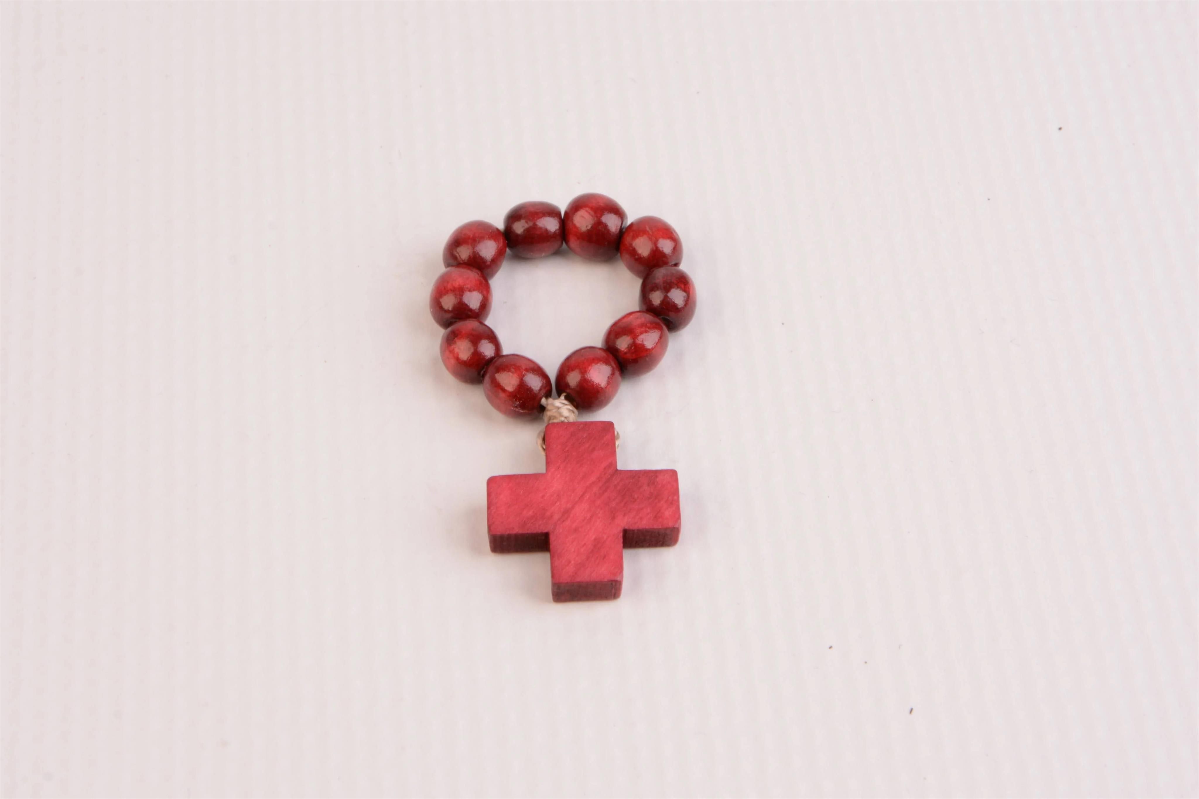Różaniec drewniany duży, w kolorze bordowym. Koraliki rozmiar 10, połączone sznurkiem z grubym węzłem. - opis pochodzi od Dostawcy