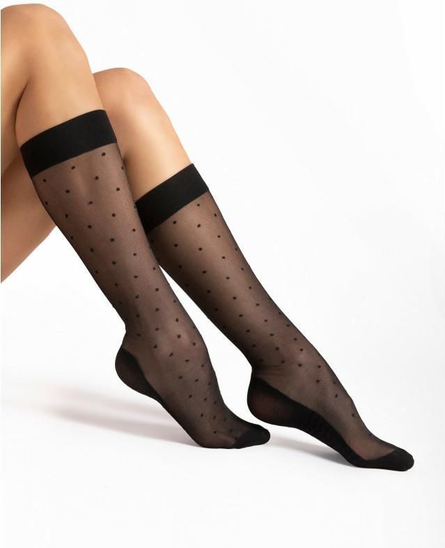 FIORE DOTS MASSAGE Podkolanówka 20 DEN BLACK / UNI Cienkie, wzorzyste podkolanówki damskie z efektem masażu, które przeniosą Twoje stopy w stan komfortu i błogości!. Ozdobione małymi kropeczkami. Transparentne, matowe, wykończone gładkim, bezuciskowym ściągaczem. Zarówno ściągacz jak i palce …