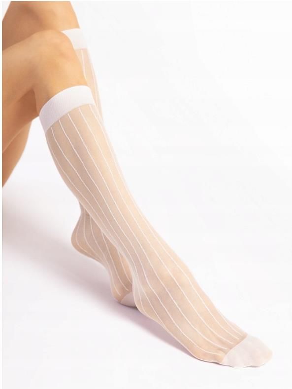 FIORE LINEA 15 DEN Podkolanówki ze wzorem w delikatne prążki. Posiadają szeroki i wygodny ściągacz. Jedwabista matowa dzianina z wzmocnioną częścią palcową oraz wzór pozwala na łączenie podkolanówek w różnych klasycznych stylizacjach. Dostępne w dwóch kolorach White i Black. Skład: 90% poliamid 10 % elastan.