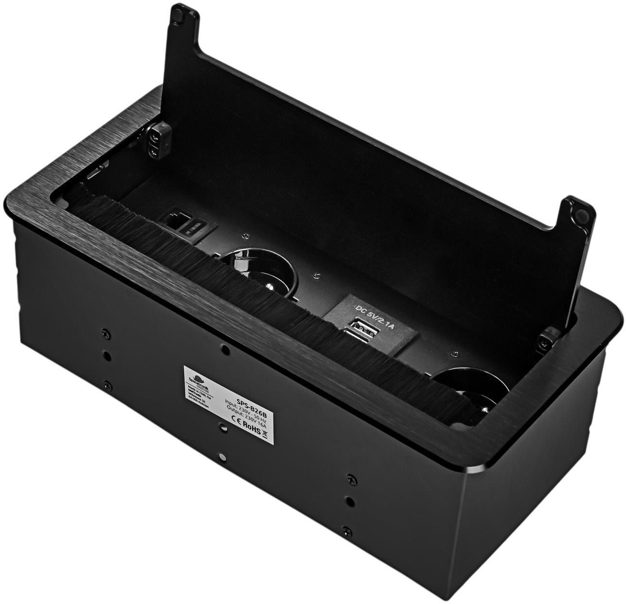 Gniazdo meblowe wpuszczane w blat biurka PODWÓJNE Mediaport HDMI USB RJ-45 SKU: SPSB26B Najważniejsze Cechy -Kompatybilność: Idealny do użytku w biurach, domach, salach konferencyjnych i salonach sprzedaży. -Uniwersalne 2x gniazda French: Gniazda typu E pozwalają na podłączenie urządzeń elektrycznych o różnych napięciach. -Elegancki design: Wykonany z wysokiej jakości aluminium w kolorze czarnym. -Łatwa instalacja: Prosty montaż poprzez wycięcie otworu w blacie i umieszczenie gniazda w odpowiednim miejscu. -Praktyczna otwierana pokrywa: Aluminiowa pokrywa chroni porty, gdy nie są używane, zapewniają estetyczny wygląd. -Długość kabla: Kabel zasilający z wtyczką typu E o długości 1,5m zapewnia wygodne podłączenie do zasilania. -Mediaport: Wyposażony w porty HDMI i Ethernet RJ-45, umożliwia podłączenie wielu urządzeń jednocześnie. -Ładowarka USB: Wyposażony w porty USB 3.0 oraz USB-C, co umożliwia podłączenie wielu urządzeń jednocześnie. Gniazdo French Bezpieczne Posiada charakterystyczny bolec uziemiający, gniazdo French zwiększa bezpieczeństwo korzystania z urządzeń elektrycznych oraz użytkowników przed porażeniem prądem. Funkcjonalne Zaprojektowane z myślą o europejskich standardach, dzięki czemu pasuje do wielu urządzeń elektrycznych. Gniazdo Meblowe z HDMI, RJ45 i Ładowarką USB HDMI Szybkie i łatwe podłączenie monitora, projektora czy telewizora. RJ45 Zapewnia stabilne połączenie z siecią internetową. USB-C i USB 3.0 Dzięki wbudowanym dwóm portom USB, możesz jednocześnie ładować 2 urządzenia, takie jak: smartfony tablety inne gadżety elektroniczne Otwierane gniazdo blatowe z klapką Otwierana konstrukcja umożliwia łatwy dostęp zasilania wtedy, gdy jest to potrzebne. Wystarczy unieść klapkę. Po zakończonej pracy można łatwo zasłonić, co pozwala na utrzymanie porządku i chroni je przed kurzem oraz uszkodzeniami. dyskretnie ukryj w blacie zachowaj estetykę i porządek Elegancja i Trwałość Gniazdo meblowe z wykończeniem w stylu szczotkowanego metalu to połączenie elegancji i wytrzymałości, które doskonale uzupełni nowoczesne wnętrza. Taki wzór nadaje gniazdu luksusowy wygląd, a jednocześnie zapewnia odporność na zarysowania i inne uszkodzenia mechaniczne. Specyfikacja Zasilanie sieciowe: 230 V 50 Hz Wymiary puszki (szer. x wys. x gł.): 25 cm x 9,4 cm x 11,5 cm Wymiary zewnętrzne: 13 cm x 26,5 cm Sugerowane wymiaru otworu w blacie: 25,3 cm x 11,7 cm Gniazda Wymienne: 1 Gniazdo HDMI: 1 Gniazdo RJ45 Ethernet CAT6: 1 Kabel zasilający: 1,5m Gniazdo 230V: 2 Ładowarka USB: 2 (USB-C, USB 3.0) Wymiary otworu: 253 mm x 117 mm Rodzaj gniazd/-a 230V: 2x typu francuskiego (French) 110-250 V (16 A) Kolor: Czarny