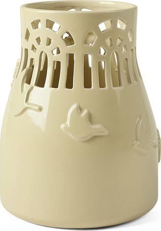 Delikatny 18-centymetrowy wazon z linii Orangery jest wykonany z ceramiki i szkliwiony na kolor Sweet Honey. U dołu ma szerszą podstawę, więc jest dużo miejsca na wodę, ale zwęża się ku górze, pięknie zbierając kwiaty. Wazon inspirowany jest światłem, architekturą, atmosferą i fakturą oranżerii, a wiele małych okien tworzących oranżerię jest odtworzanych u góry wazonu. Prawie jak nowoczesna koronka, pozwala zerknąć na łodygi kwiatów – dokładnie tak, jakbyś zaglądał do oranżerii. Każdy mały element jest wykonany ręcznie, podobnie jak stylizowane ptaki w różnych kształtach, które zdobią zewnętrzną stronę Cała linia to różne kształty i rozmiary wazonów i domków, które możesz dowolnie łączyć i miksować, tworząc jedno lub różnorodne zestawienia według własnego pomysłu. Kolor: żółty odcień Sweet Honey. Wymiary: wysokość 18 cm x średnica 14,5 cm. Materiał: ceramika. Produkt marki Kahler Design. Zapakowany w eleganckie pudełko. Idealny na prezent.