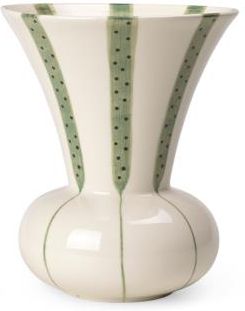 Uroczy i wyjątkowy wazon od Kähler, którego źródłem inspiracji jest natura. Nie ma nic piękniejszego niż ten wazon. Powyższy wazon Signature Vase ma unikalny kształt przypominający lejek do kwiatów, co nadaje mu wyjątkowy styl i urok. Wazon ma dołączoną ceramiczną płytkę z otworami inspirowanymi podstawką nasienną planety lotosu. Pozwala to na uporządkowanie kwiatów dokładnie tak, jak lubisz. Możesz również użyć wazonu w tradycyjny sposób, bez talerza, do zwykłego wiązanego bukietu. Wazon jest wykonany z kamionki z ręcznie malowaną dekoracją. Wazony mają życie, dynamizm i autentyczność w wyrazie. Wazon jest ozdobiony zielonymi paskami mchu w dolnej części wazonu, które przechodzą w szersze paski z czarnymi kropkami w górnej części. Dekoracja przypomina pręciki kwiatowe, gdzie paski dążą w górę i nadają wazonowi życia i ruchu. Jest to bez wątpienia wazon, który będzie pasował do każdego domu, niezależnie od stylu wystroju wnętrza. Wynika to z wyjątkowego i uroczego designu, który sprawia, że wazon jest bardzo piękny. Informacje o produkcie: Materiał: Kamionka Wysokość: 20 cm Kolor: zielony / biały Wzór: MeyerLavigne