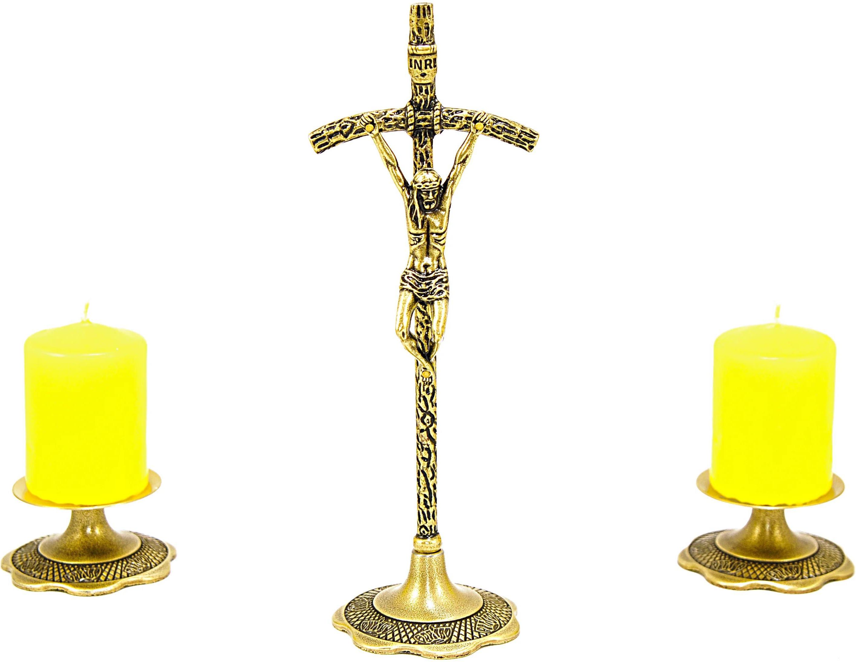Zestaw kolędowy "papieski", kolor stare złoto ( odlew ze stopu cynku, pokryty powłoka galwaniczną) Wysoka jakość wykonania, produkt polski. W skład zestawu wchodzą: krzyż stojący h 185 mm - 1 szt. świecznik h 28 mm - 2 szt. świeca żółta h 55mm - 2 szt Zestaw zapakowany jest w eleganckie pudełko.
