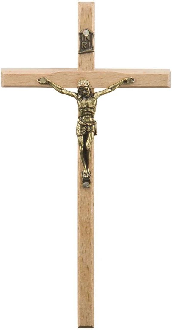 Krzyż wiszący wykonany z drzewa bukowego, wyskość 15 cm, wizerunek Chrystusa o wielkości 5,5 cm to odlew stopu cynku.