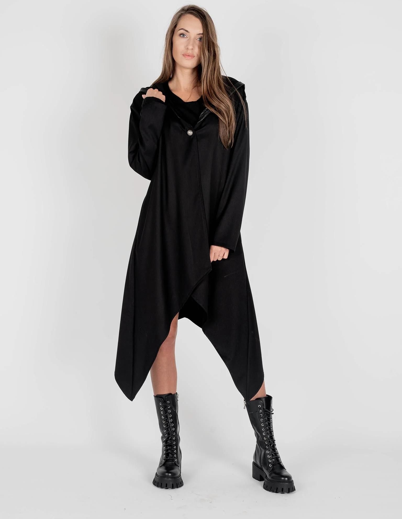 Unisex Prosty, dłuższy fason Z kapturem Zapinana na jeden, zdobny guzik Z przodu dwie kieszenie Wykonana z połączenia dwóch, wysokiej jakości tkanin Wyprodukowano we Włoszech