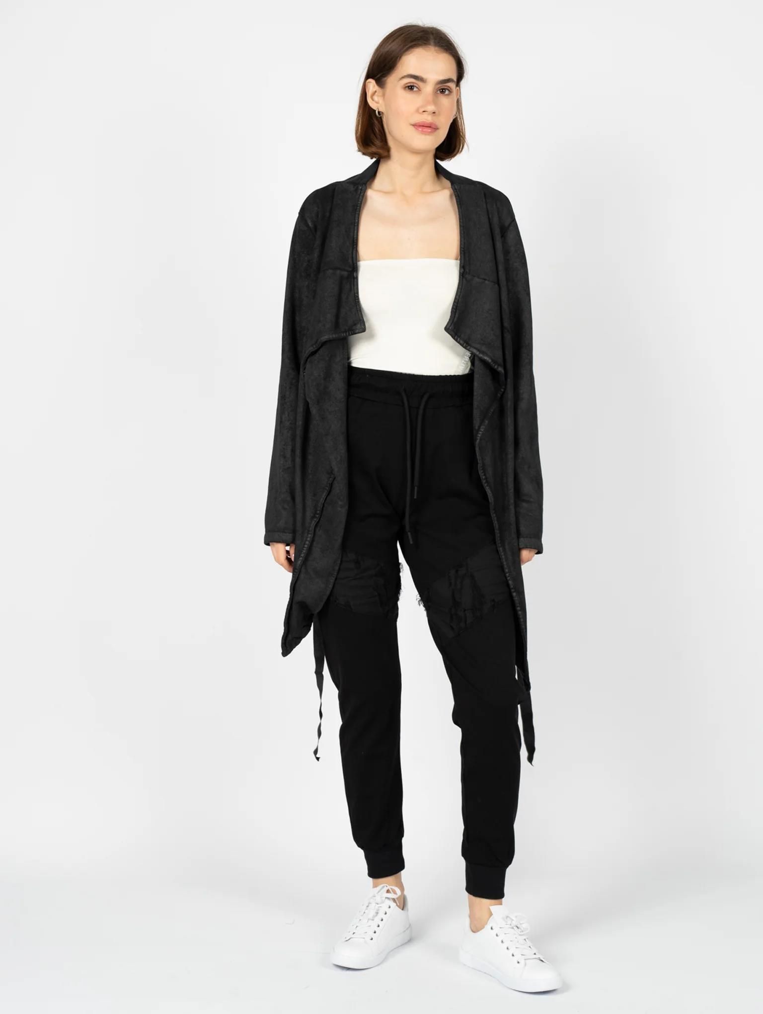 Prosty fason W pasie wszyta guma, dodatkowo regulowane sznurkiem Z obniżonym krokiem Szersze w udach, ze zwężanymi nogawkami Z ozdobnymi przeszyciami oraz przetarciami Z przodu dwie kieszenie zapinane na zamek błyskawiczny Końcówki suwaków logowane Nogawki wykończone ściągaczami Wykonane z wysokiej jakości tkaniny Wyprodukowane we Włoszech