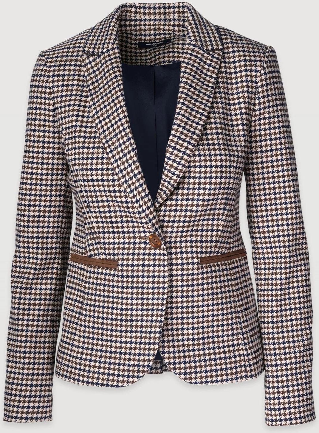Marynarka damska w pepitę Wybierając elegancką, jednorzędową marynarkę damską marki Willsoor bez wątpienia przekonasz się do noszenia jej nie tylko od święta, ale również na co dzień! Marynarka jest lekka i wygodna, dzięki czemu nawet nie poczujesz, że masz na sobie tak niebywale elegancki strój. Została uszyta z wysokiej jakości materiału, który jest elastyczny i delikatny w dotyku. Krój wyraźnie podkreśla linię talii. Guziki oraz kieszenie z patkami stylowo uzupełniają nowoczesny design marynarki. Skład tkaniny: 18% wiskoza, 80% poliester, 2% Spandex Skład podszewki: 94% poliester, 6% elastan Rodzaj marynarki: jednorzędowa, zapinana na jeden guzik Kolor główny: brązowa, beżowa i granatowa pepita Wykończenia: brązowe nałokietniki, obszycia kieszeni i guziki Producent: Willsoor Gwarancja: 24 m-ce Uszyta w Polsce