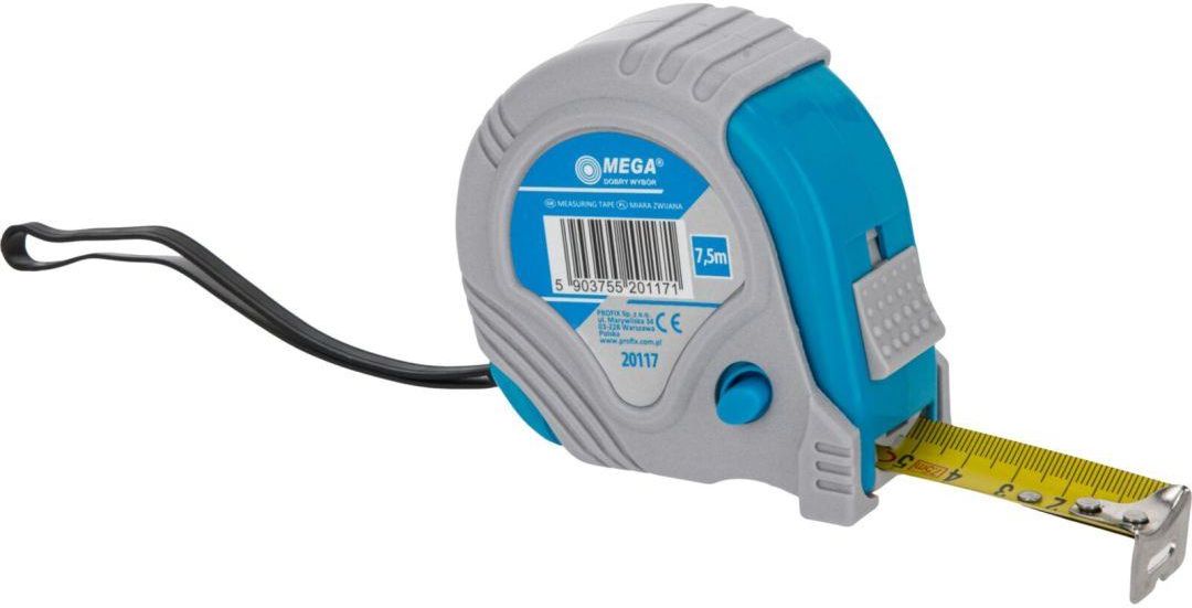 Miara zwijana 75 m 25mm 3 stopery osłona gumowa skin pack Mega 20117K Miara zwijana MEGA 20117K o długości 7,5m z taśmą 25mm i II klasą dokładności. Posiada 3 hamulce (w tym dolny) oraz obudowę w gumowej osłonie antypoślizgowej. Dostarczana w Skin Packu. Idealna do prac budowlanych, stolarstwa i instalacji. Zapewnia wysoką precyzję, wygodę i trwałość użytkowania. Jest wszechstronnym i niezawodnym narzędziem, które doskonale sprawdzi się w każdych warunkach. MIARA ZWIJANA 7.5m 25mm 3 hamulce SKIN PACK MEGA 20117K Miara zwijana MEGA 20117K to profesjonalne narzędzie z trzema hamulcami i antypoślizgową obudową, dostarczane w praktycznym opakowaniu typu Skin Pack, idealne do wszelkich prac wymagających dokładnych pomiarów. Cechy produktu Miara zwijana o długości 7,5 metra, optymalna do szerokiego zakresu zadań pomiarowych. Wyposażona w taśmę o szerokości 25 mm, zapewniającą czytelność i stabilność. Posiada II klasę dokładności, gwarantującą wysoką precyzję pomiarów. Innowacyjny system z trzema hamulcami, w tym jednym od dołu, zapewnia maksymalną kontrolę. Obudowa w osłonie gumowej antypoślizgowej, zwiększająca trwałość i pewność chwytu. Dostarczana w opakowaniu typu Skin Pack, co ułatwia ekspozycję i ochronę produktu. Zastosowanie Prace budowlane i remontowe – precyzyjne mierzenie odległości, materiałów i konstrukcji w trudnych warunkach. Stolarstwo i prace wykończeniowe – dokładne wymiarowanie elementów drewnianych, paneli i listew. Instalacje – precyzyjne wyznaczanie punktów montażowych dla rur, przewodów i urządzeń. Majsterkowanie i projekty DIY – wszechstronne zastosowanie w domowych i garażowych zadaniach. Korzyści Precyzja:II klasa dokładności oraz szeroka taśma 25 mm zapewniają niezawodne i precyzyjne odczyty. Wygoda użytkowania:Trzy hamulce, w tym jeden dolny, umożliwiają łatwe i stabilne blokowanie taśmy w dowolnej pozycji, zwiększając komfort pracy. Wytrzymałość:Obudowa w osłonie gumowej antypoślizgowej gwarantuje solidność i odporność na upadki i uszkodzenia, zapewniając długą żywotność narzędzia. Funkcjonalność: Długość 7,5 metra i innowacyjne rozwiązania sprawiają, że miara doskonale sprawdza się w różnych warunkach i sytuacjach. Dane techniczne Długość: 7,5 m Szerokość taśmy: 25 mm Klasa dokładności: II Hamulce: 3 (w tym jeden od dołu) Obudowa: Gumowa osłona antypoślizgowa Opakowanie: Skin Pack Marka: MEGA Kod produktu: 20117K Miara zwijana MEGA 20117K to niezbędne narzędzie dla profesjonalistów i wymagających majsterkowiczów. Kod produktu: 20117K EAN: 5903755034847