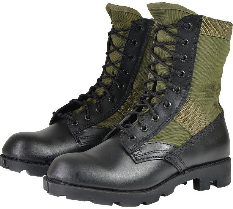 Buty Mil-Tec US Jungle Boots - Olive 41 (12826001-008) Wysokość buta: Wysokie Materiał cholewki: Skóra licowa + syntetyk Membrana: Nie Wyściółka ocieplająca: Nie Sposób mocowania: Sznurowanie Płeć: Męska Kolor/kamuflaż: Odcienie zieleni Kolor główny: Olive Waga: 1140 g (rozmiar 42) Kod producenta: 554- Producent: Mil-Tec Buty wojskowe w kolorze oliwkowym, inspirowane legendarnym modelem "Jungle" używanym przez amerykańskie wojska podczas konfliktu w Wietnamie, charakteryzują się lekkością, wygodą i możliwością całorocznego użytkowania. Wykonane z wodoodpornej skóry i solidnego nylonu. Na poziomie kostek zastosowano dodatkowe taśmy wzmacniające konstrukcję i usztywniające stopę. Miękka wkładka z pianki EVA zapewnia komfort przy długotrwałym użytkowaniu. Podeszwa antypoślizgowa z bieżnikiem typu Panama poprawia amortyzację i zapobiega przyleganiu błota. Wbudowana stalowa wkładka chroni przed przebiciem. Usztywniono pięty, a palce wzmocniono dla większej wygody. Dziewięć przelotek umożliwia szybkie sznurowanie, a boczne otwory drenażowe odprowadzają wodę z wnętrza buta. Główne cechy: trwała konstrukcja ze skóry i nylonu, miękka wkładka EVA, antypoślizgowa podeszwa z bieżnikiem typu Panama, stalowa wkładka, wzmocnione pięty i palce, otwory drenażowe.