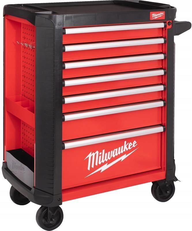 WÓZEK NARZĘDZIOWY 78CM / 30″ NA KÓŁKACH Z 7 SZUFLADAMI | SRC30-1 Szuflady o ładowności 45 kg z cichym domykiem. Ładowność 90 kg dla dolnej szuflady. Zabezpieczenie przed przechyleniem - jednocześnie można otworzyć 1 szufladę. Każda szuflada posiada matę antypoślizgową. Wpuszczony, gładki blat z ABS z otworami na wkrętaki i dodatkowymi schowkami. Amortyzujące narożniki z ABS. Magnetyczna listwa zasilająca umożliwia ładowanie akumulatorów bezpośrednio na szafce. Tablica z otworami na haki i uchwyty pozwala na łatwy dostęp do najczęściej używanych narzędzi. Dodatkowe boczne półki na butelki i puszki. Organizer na elektronarzędzia w dolnej szufladzie. Przemysłowe koła 125 mm (2x stałe, 2x obrotowe z hamulcami). Całkowity udźwig 800 kg. Górna dostawka dostępna jako oddzielny numer artykułu: 4932478850