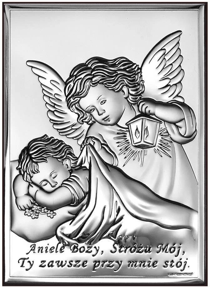 Obrazek srebrny Aniołek z latarenką, z podpisem: "Aniele Boży, Stróżu Mój, Ty zawsze przy mnie stój". Idealny jako pamiątka z okazji Chrztu Świętego. Obrazek wyprodukowany został przez firmę Beltrami. Gwarantuje ona, iż przedmiot nabyty przez Państwa został wyprodukowany we Włoszech, zgodnie z kunsztem i tradycją obróbki metali szlachetnych. Do produkcji wykorzystano innowacyjny metal szlachetny o nazwie MIRO-SILVER, opatentowany na terytorium całej Europy. Jest to nowoczesny surowiec pokryty w procesie atomowym warstwą czystego srebra 999,95. Otrzymany drogocenny metal posiada wyjątkowe cechy, przewyższając jakością materiały pozyskiwane metodami tradycyjnymi. Jest odporniejszy na odkształcenia mechaniczne i śniedzenie, doskonale odbija światło, co podkreśla szlachetność srebra. Obrazek zabezpieczony jest warstwą lakieru, która chroni przed czynnikami zewnętrznymi. Wpływa to na bezproblemowe użytkowanie bez potrzeby częstego czyszczenia. Obrazek można zarówno powiesić, jak i postawić na dołączonej podstawce. Do czyszczenia zalecamy używanie wyłącznie czystych, miękkich ściereczek, a w przypadku zabrudzeń letniej wody. Nie należy stosować detergentów, alkoholu ani znajdujących się w sprzedaży środków i ściereczek do czyszczenia srebra, gdyż mogą one uszkodzić warstwę ochronną.