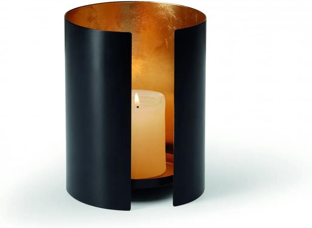 Świecznik Isabelle marki Philippi. Świecznik został wykonany z malowanej stali w kolorze czarnym. Jest on matowym na zewnątrz co daje mu wspaniały design. Wnętrze wykończone jest złotymi płatkami. Dzięki dokonaniu tego zabiegu, podczas palenia świeczki wspaniale odbija się światło. Świecznik posiada ozdobny wycięcie idące przez całą wysokość. Znakomicie pasuje do większości wnętrz i daje ciekawy klimat. Niemiecka marka Philippi tworzy niepowtarzalny styl i słynie z eleganckiego designu. Wymiary: średnica 14 cm, wysokość 18 cm.