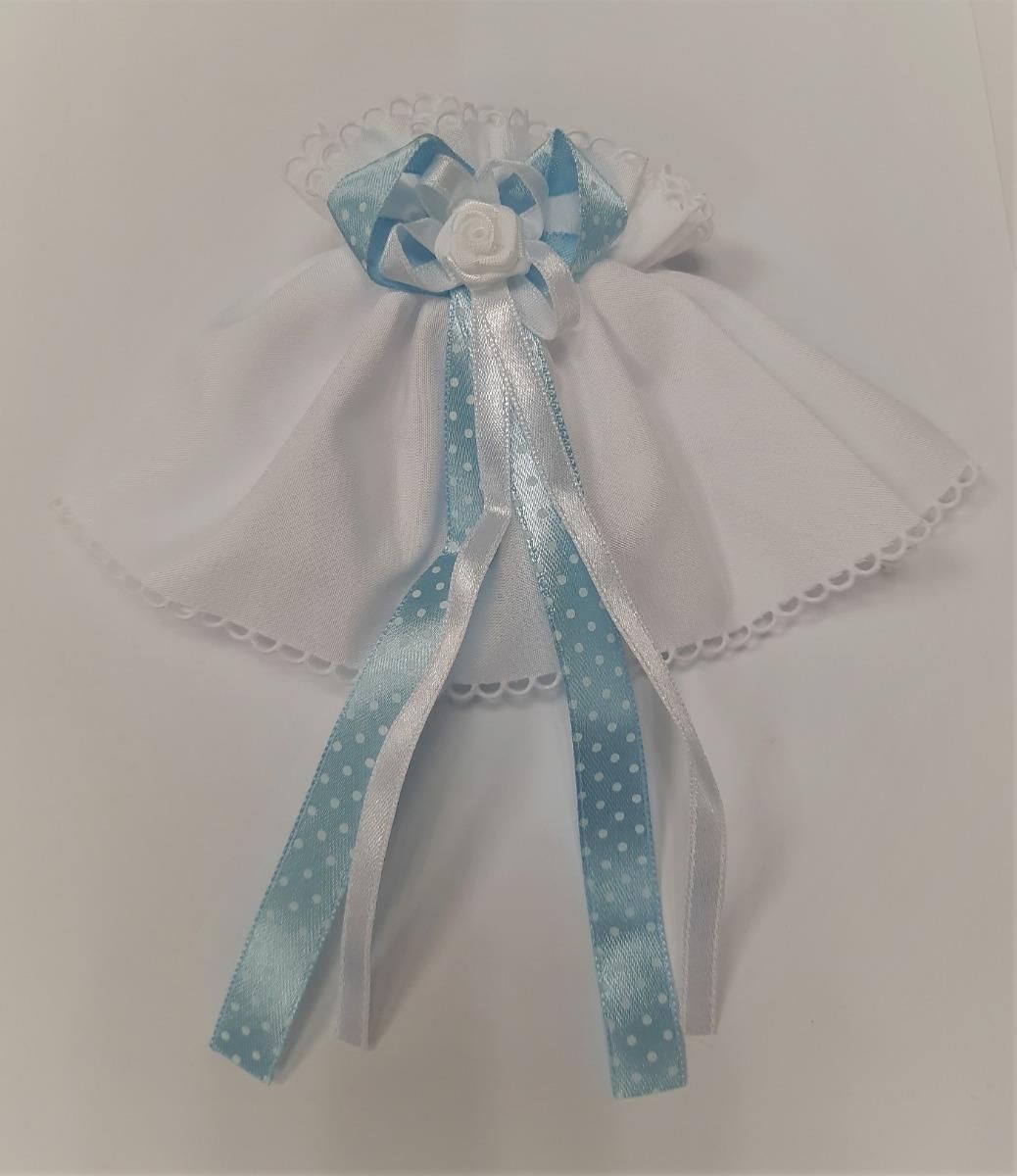 Profitka atłasowa z białym kwiatkiem i niebieską wstążeczką kropki Środa Wielkopolska