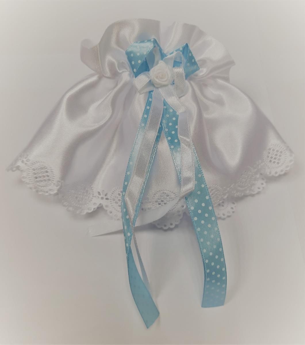 Profitka satynowa z białym kwiatkiem i niebieską wstążeczką kropki Środa Wielkopolska
