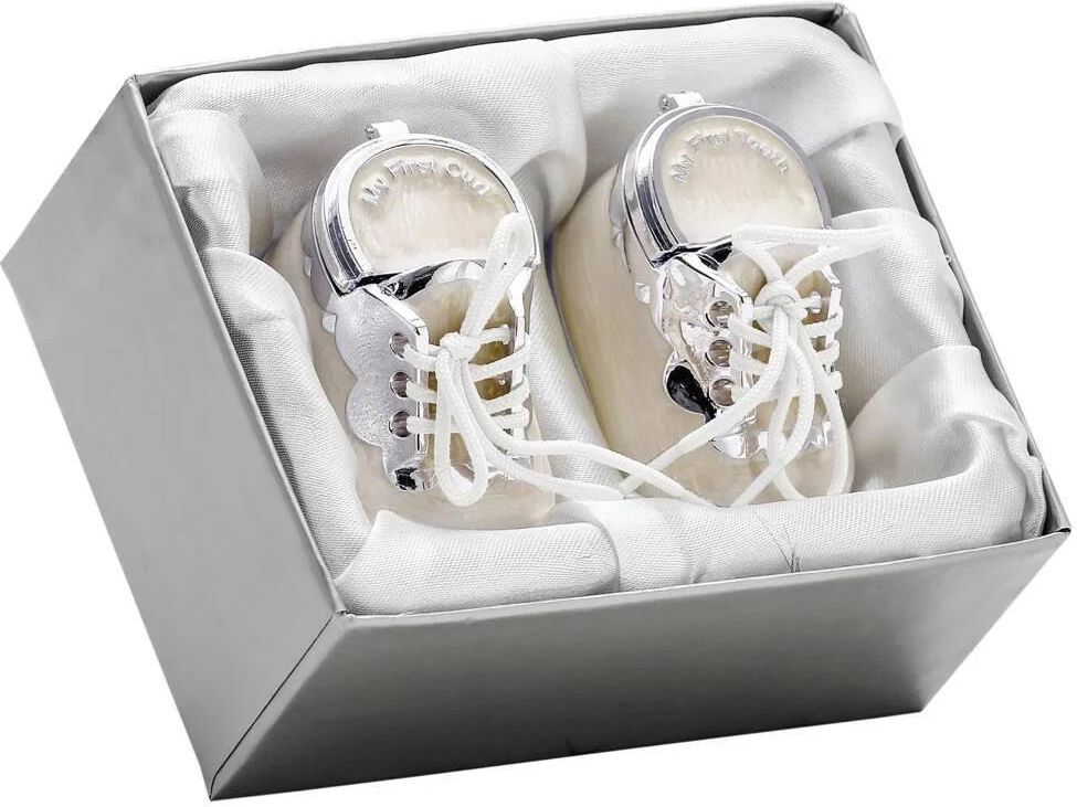 Puzderka na pierwszy ząbek oraz pukiel włosów. Na bucikach znajdują się napisy "My first tooth" oraz "My first curl" Idealna pamiątka Chrztu Św. lub prezent urodzinowy dla dziecka. Wymiary szkatułek: 6,2x3,6x3,4 cm