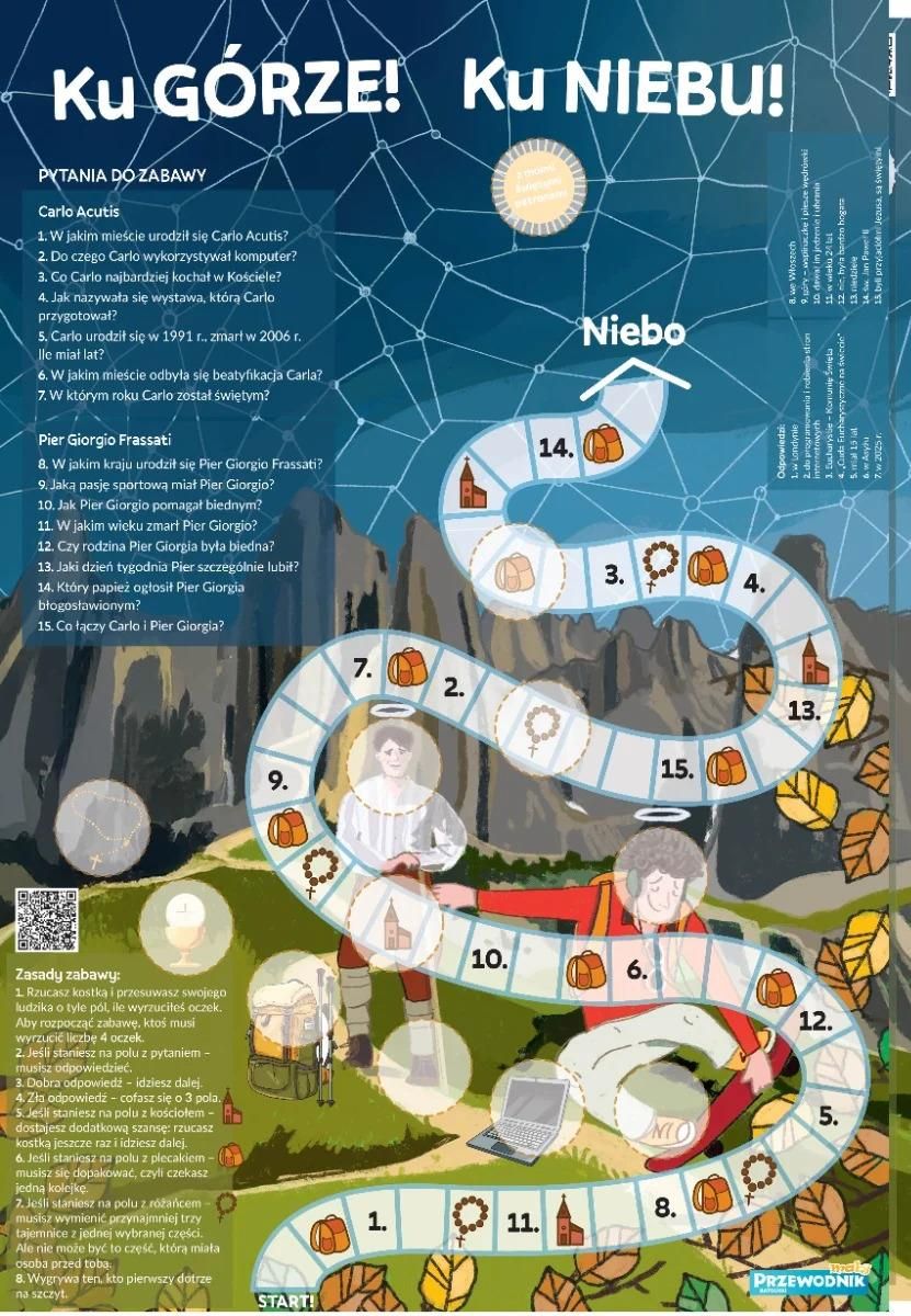 Niedziela z Owieczką 2025/2026 już dostępna w przedsprzedaży. Wysyłki będą realizowane od 9 lipca 2025 roku. Z różańcem w dłoni i mocni Eucharystią z nowymi świętymi ruszamy w kierunku nieba! Jedni pójdą ostrożnie – jak czarnym górskim szlakiem. Inni pomkną niczym autostradą. A nad wszystkimi czuwać będą święci Carlo Acutis i Pier Giorgio Frassati – którzy nie tylko sami doszli tam bardzo szybko, ale i nam obiecali w tym pomóc. W komplecie: Plansza z najważniejszymi informacjami o świętych i 20 naklejek w kształcie ziarenek różańcowych + QR kody przekierowujące do pełniejszych informacji i ciekawostek na ich temat. Do tego ciekawa zabawa ułatwiająca zapamiętanie najważniejszych szczegółów z ich życia, którą można wykorzystać podczas: nabożeństw różańcowych, katechez, spotkań duszpasterskich i rodzinnych. Format: A3 składana do A4 + 20 naklejek. Produkt pakowany po 10 kompletów. Zasady zabawy uzupełniającej: Rzucasz kostkę i przesuwasz swojego ludzika o tyle pól, ile wyrzuciłeś oczek. Aby rozpocząć zabawę, ktoś musi wyrzucić liczbę 4 oczek. Jeśli staniesz na polu z pytaniem – musisz odpowiedzieć. Dobra odpowiedź – idziesz dalej. Zła odpowiedź – cofasz się o 3 pola. Jeśli staniesz na polu z kościołem – dostajesz dodatkową szansę; rzucasz kostką jeszcze raz i idziesz dalej. Jeśli staniesz na polu z plecakiem – musisz się dopakować, czyli czekasz jedną kolejkę. Jeśli staniesz na polu z różańcem – musisz wymienić przynajmniej trzy tajemnice z jednej wybranej części. Ale nie może być to część, którą miała osoba przed tobą. Wygrywa ten, kto pierwszy dotrze na szczyt. Wydawca / dane producenta Święty Wojciech Dom Medialny sp. z o. o. Wydawnictwo ul. Chartowo 5 61-245 Poznań wydawnictwo@swietywojciech.pl tel. 61 659 37 13 Kraj pochodzenia produktu / kraj produkcji: Polska