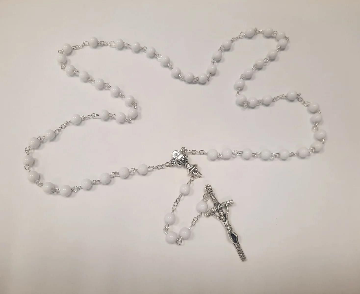 Różaniec biały, ośmiokątny Różaniec z paciorkami w kształcie ośmiokątów, w białym odcieniu. Poszczególne koraliki połączone są drutem, a każdy z nich ma średnicę ok. 5 mm. Całości dopełnia piękny krzyżyk. Różaniec idealnie nadaje się jako prezent na Pierwszą Komunię Świętą.