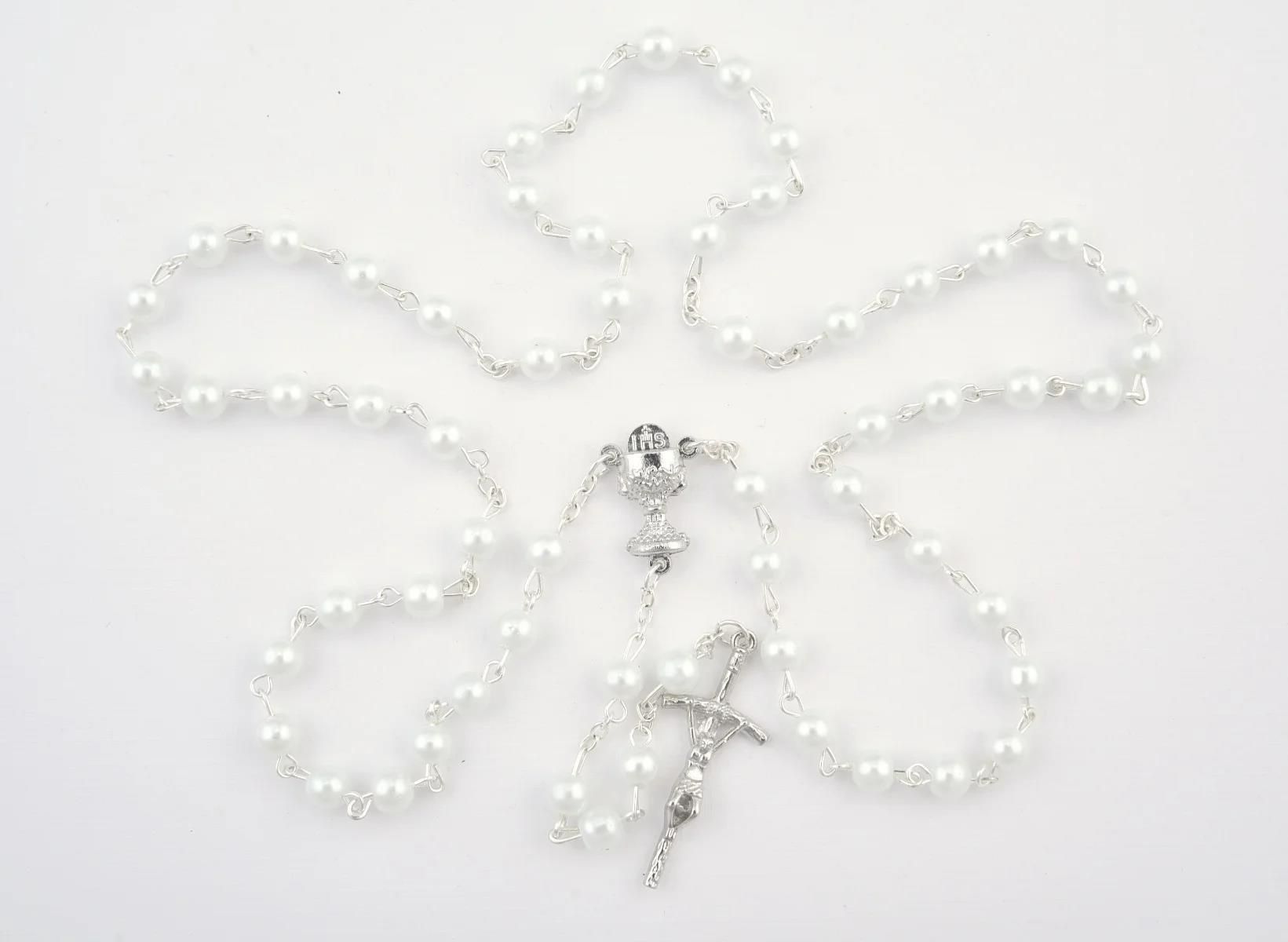 Różaniec komunijny perłowa kulka Różaniec wykonany z koralików w kolorze perłowym połączonych metalowymi ogniwami oraz krzyżyka i medalika w srebrnym kolorze. Kulka w kolorze perłowym prezentuje się niezwykle elegancko, różaniec może być podarunkiem, który dziecko otrzyma w kościele lub stanowić …