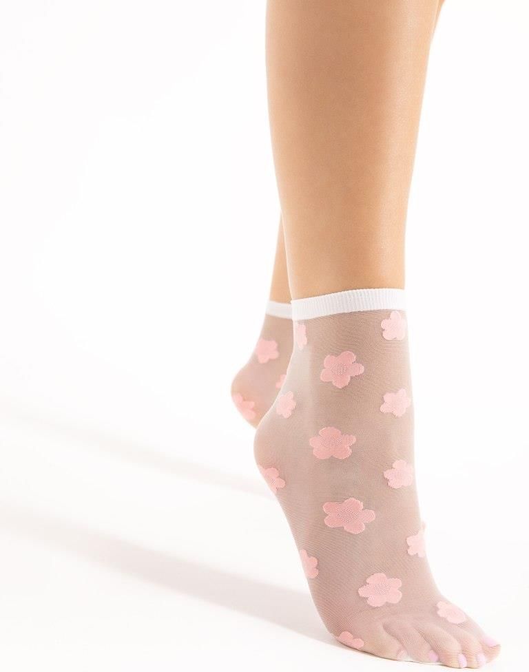 FIORE JODIE Skarpetki damskie 20 DEN Off White / UNI Cienkie skarpetki damskie ozdobione wzorem w niewinne kwiatki. Transparentne, matowe, wykończone delikatnym, wąskim ściągaczem. Model bez zaznaczonych palców świetnie sprawdzi się do odkrytego obuwia. Rozmiar uniwersalny. Grubość: 20 DEN. Skład: …