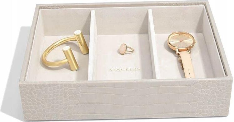 Szkatułka na biżuterię Stackers Croc 3 komorowa classic putty Stan: Nowy Marka Stackers specjalizuje się w niezwykle eleganckich i praktycznych szkatułkach oraz pudełkach na biżuterię damską i akcesoria męskie. W ofercie znajdują się wykonane z największą dokładnością pudełka oraz etui (również …