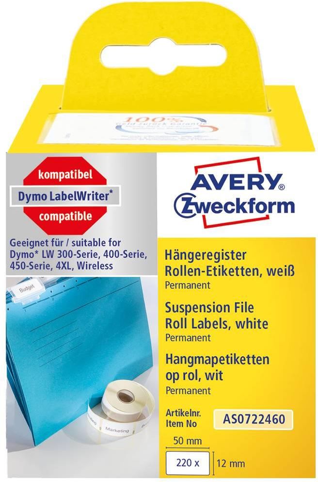 Etykiety do drukarek etykiet W 100% zgodny z DYMO® LabelWriter™ (seriaLW310, LW330T, LW400 i LW450) Produkt jest zgodny z DYMO® S0722460 (99017) Proste etykietowanie z etykietami Avery Zweckform z oprogramowaniem Dymo® Niezawodne i trwale silne właściwości klejące Białe, przyklejane na stałe etykiety AS0722460 w formacie 12 x 50 mm firmy Avery Zweckform szczególnie nadają się do etykietowania wieszanych rejestrów. Każde opakowanie zawiera 220 etykiet. Naklejki te są w 100% kompatybilne z DYMO® LabelWriter™ (serii LW310, LW330T, LW400 i LW450). Wymień swoje oryginalne Etykiety Dymo® na wysokiej jakości i atrakcyjne cenowo etykiety Avery Zweckform. Te etykiety termiczne odpowiadają DYMO® S0722460 (99017). Etykiety Avery Zweckform do wiszących rejestrów mogą być szybko i łatwo zaprojektowane z oprogramowaniem Dymo®. Dane techniczne: Etykieta: Prostokątny · Kolor: biały · Kolor nadruku: czarny · Odpowiednie do (techniki druku): Drukarka termiczna bezpośrednia · Pasuje do Marki: DYMO · Pasuje do Modelu: LabelWriter 310,LabelWriter 330T,LabelWriter 400,LabelWriter 450,LabelWriter Wireless · Rodzaj produktu: Etykiety do rejestratorów wiszących · Rodzaj zamiennika: 99017,S0722460 · Szerokość etykiety: 50 mm · Typ etykiety: Papier · Wielkość etykiet: 50 x 12 mm · Wykonanie tuszu, tonera: zamiennik · Wysokość etykiety: 12 mm · Właściwości kleju: Trwały · Zawartość: 220 szt.