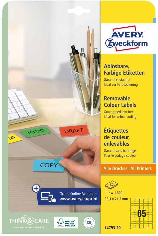 USUWALNE ETYKIETY KOLOROWE Doskonale nadają się do czasowego, tematycznego oznaczania dokumentów oraz sprzętów biurowych. Etykiety usuwalne, które pozwalają łatwo wymienić oznaczenia dokumentów. Po ich usunięciu nie pozostają ślady kleju. Przeznaczone do zadruku w drukarkach atramentowych, laserowych, laserowych kolorowych oraz kopiarkach. Gwarantowany brak zacięć podczas zadruku na drukarkach laserowych potwierdzony certyfikatem TUV. Wyraźny wydruk. Dostępne w czterech kolorach (czerwony, zielony, niebieski, żółty). Etykiety samoprzylepne z certyfikatem FSC są przyjazne dla środowiska i nie zawierają chloru. Papier pochodzi z odpowiedzialnie zarządzanych zasobów leśnych, a etykiety podlegają pełnej utylizacji jako odpad papierowy. Produkcja etykiet Avery Zweckform jest neutralna pod względem emisji CO2 (certyfikat Focus Future) i zgodna ze standardem ISO14001, który pomaga zminimalizować negatywne czynniki oddziałujące na środowisko naturalne Rozmiar etykiety 38,1 x 21,2 mm Ilość etykiet na arkuszu 65 Ilość arkuszy w opakowaniu 20 w formacie A4 Ilość etykiet w opakowaniu 1300 Kolor żółty Kod producentanbsp;L4793-20 "