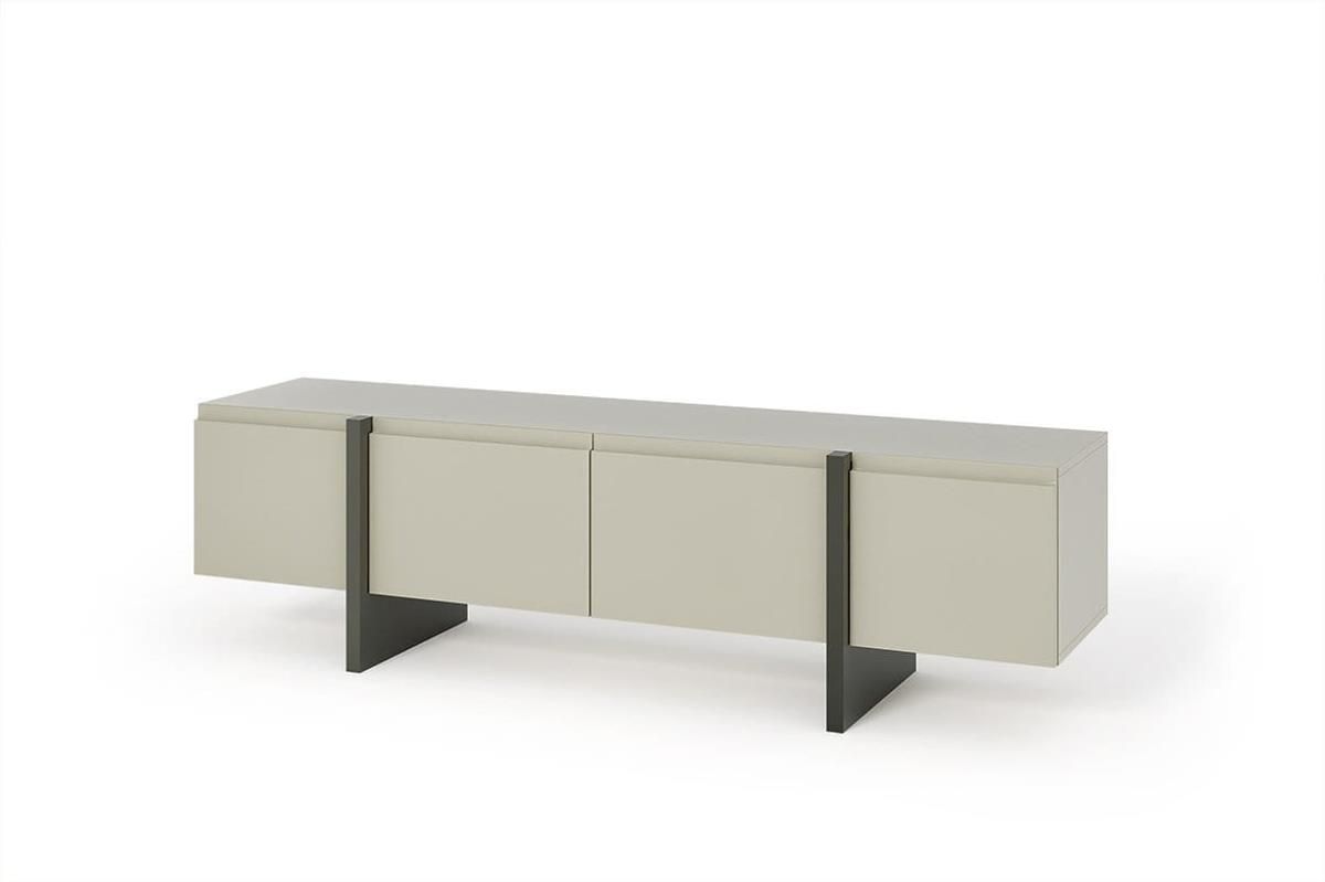 Szafka RTV Prince 180 to niezwykle stylowe i funkcjonalne rozwiązanie, które podkreśli nowoczesny charakter Twojego salonu. Z unikalnym designem i praktycznymi rozwiązaniami, mebel ten stanowi idealne połączenie elegancji i funkcjonalności. Korpus szafki wykonany jest z trwałej płyty laminowanej o grubości 16 mm, w delikatnym odcieniu Kaszmir. To subtelne wykończenie nadaje meblowi lekkości i wprowadza do wnętrza delikatny, przyjemny akcent. Fronty szafki, z płyty MDF o grubości 16 mm, zachwycają prostotą i elegancją. Klasyczny wygląd frontów doskonale komponuje się z resztą mebla, tworząc spójną całość. Wyfrezowane uchwyty to nie tylko praktyczne rozwiązanie, ale także designerski element, który dodaje szafce charakteru. Nogi i rama szafki, w kolorze grafitowym, tworzą stabilną konstrukcję. Nogi w formie ramy nie tylko dodają meblowi elegancji, ale również zapewniają solidne wsparcie, co jest szczególnie istotne przy meblach RTV. Szafka RTV Prince 180 oferuje innowacyjne rozwiązania organizacyjne. Dwie boczne półki otwierane do boków oraz dwie środkowe półki otwierane do dołu (klapki) umożliwiają wygodny dostęp do przechowywanych przedmiotów, jednocześnie dodając meblowi nowoczesności. To nie tylko szafka RTV, to designerski element, który stanie się nieodłączną częścią Twojego salonu. Szafka RTV Prince 180 to połączenie funkcjonalności, stylu i elegancji, tworząc niepowtarzalną przestrzeń do przechowywania sprzętu elektronicznego oraz dekoracyjnych elementów.